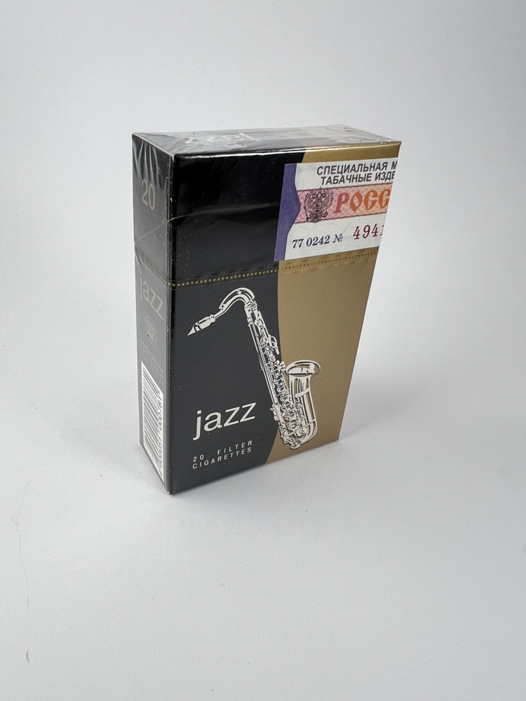 The Jazz Filter Cigarettes pack features a modern, minimalist design with a combination of black and gold colors. The front side features a saxophone outline, emphasizing the musical theme of the name "Jazz". The top part features the white brand name on a black background, and the bottom part features the inscription "20 Filter Cigarettes". The pack is unopened, with the original film and Russian excise tape.