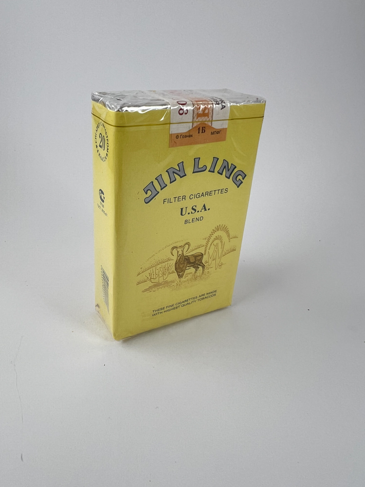 Description: Bright yellow metal box with the inscription "Jin Ling Filter Cigarettes USA Blend" and a stylish illustration of a goat. The design is minimalistic, but distinctive, designed to stand out among standard paper packets. The front and back of the box are identical, with additional information on the sides. The metal surface is smooth, with security seals and an excise mark.