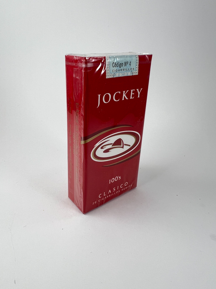 Jockey Clásico 100’s cigarečių pakelis išsiskiria ryškiai raudonu fonu, minimalistiniu dizainu ir prekių ženklui būdingu logotipu – stilizuotu jojiko šalmu. Pakelio priekyje nurodyta „100’s“ ir „CLÁSICO“, o apačioje užrašyta „20 CIGARRILLOS RUBIOS“. Ant pakelio viršaus išlikęs originalus argentiniškas akcizo ženklas su įrašu „IMP. INT. LEY 24.674“ arba „Código Nº 4“, rodantis importo mokesčio registraciją. Šoninis užrašas „SOLO PARA ADULTOS“ nurodo, kad produktas skirtas tik suaugusiems. Pakelis skirtas ispanakalbiams vartotojams, o „Jockey Club“ įrašas ant šoninės briaunos patvirtina vietinį prekinį subženklį.