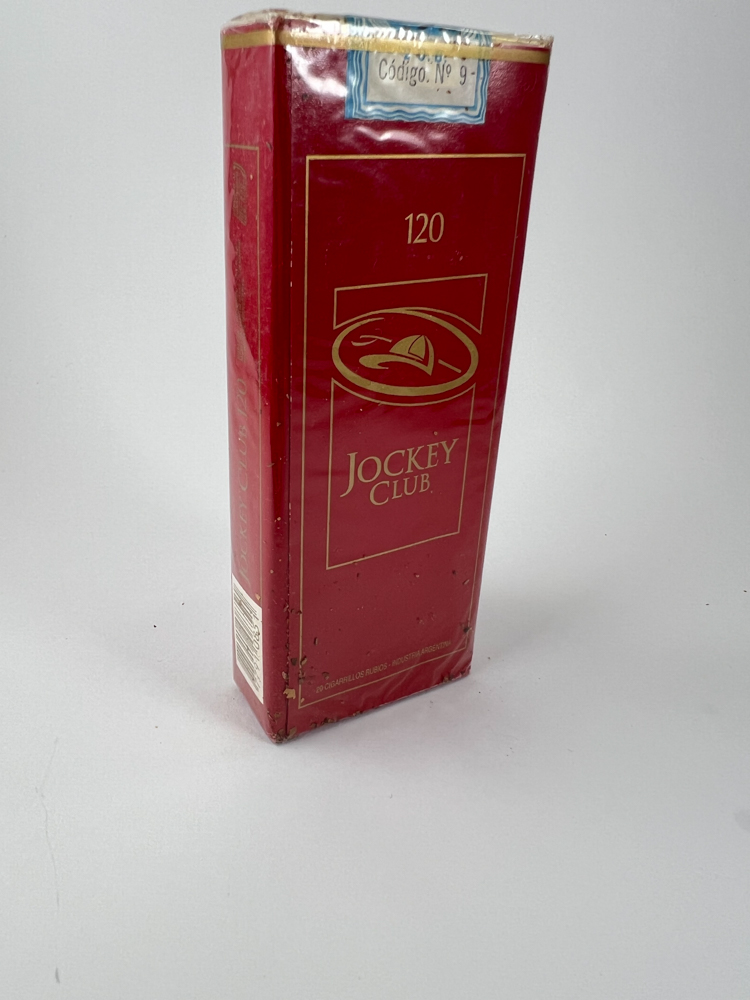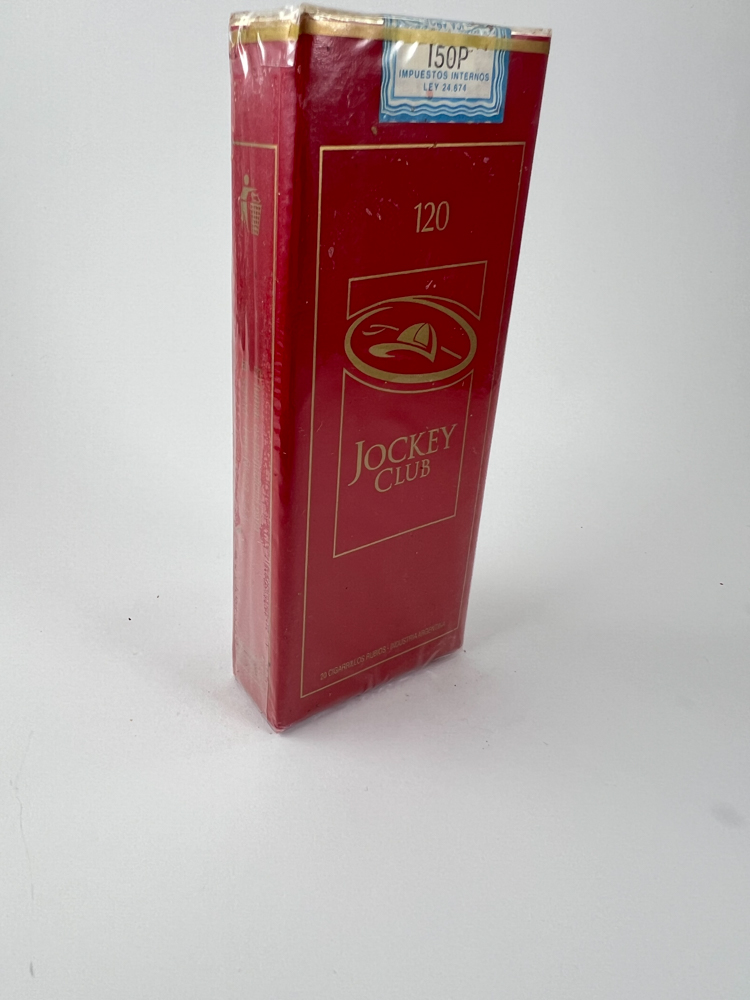 Description: Jockey Club – vienas tradicinių Argentinos cigarečių prekių ženklų, siejamas su sportišku, prestižiniu įvaizdžiu. Šis pakelis – ypatingas 120 mm formato variantas, orientuotas į prabangos segmentą. Pakelis ryškiai raudonas, dekoruotas auksiniu rėmeliu bei minimalistiniu jojimo simboliu. Viršuje – mėlynos spalvos argentinietiškas akcizo lipdukas. Dizainas išlaikytas paprastas, bet tuo pačiu elegantiškas, atspindintis 90-ųjų Argentinos tabako rinkos stilių.