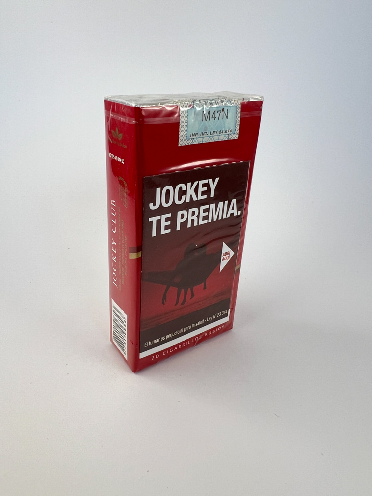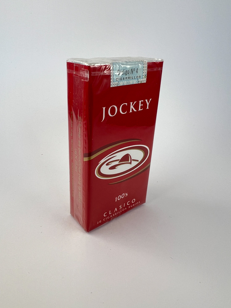 Description: This pack of Jockey Club Clásico 100's cigarettes features a bright red design with a white Jockey logo and a stylized jockey helmet symbol. The front clearly states that these are 100 mm long cigarettes. The back features the advertising campaign "Jockey te premia" with horse racing graphics and a warning about the harms of smoking in accordance with Ley Nº 23.344. At the top is an Argentine excise sticker with the code "Código Nº 4 / M47N". The pack is intended for the local market and is often associated with a sporty or masculine image.