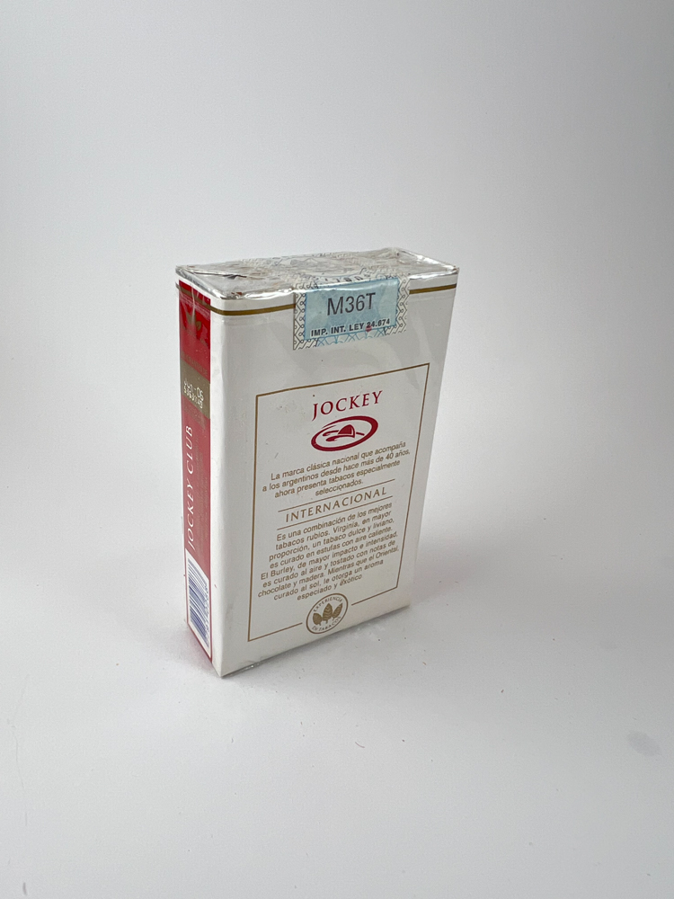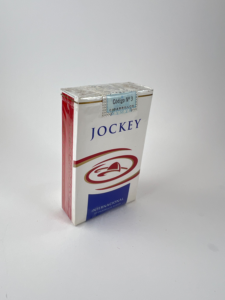 Jockey „Internacional“ – modernizuota klasikinio argentinietiško prekės ženklo „Jockey Club“ versija, išleista kaip tarptautinio stiliaus leidimas su ryškiais dizaino kontrastais. Pakelis baltas, su vertikalia raudona juostele kairėje pusėje ir charakteringu jojiko simboliu raudoname apskritime. Apačioje pateiktas mėlynas stačiakampis su įrašu „INTERNACIONAL“, nurodančiu švelnesnį, subalansuotą skonį („20 Cigarillos Rubios“). Viršuje aiškiai matomas mėlynas Argentinos akcizo lipdukas „Código N°3 CIGARRILLOS“, pagal įstatymą „Ley 24.674“. Ant galinės pusės tekstu pabrėžiamas prekės istorinis ryšys su nacionaliniu paveldu bei naudojamų tabakų kokybė („Virginia“ ir „Burley“). Pakelis nepažeistas, visiškai užklijuotas celofanu, kampai tvarkingi, spalvos neišblukusios.