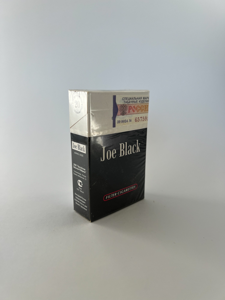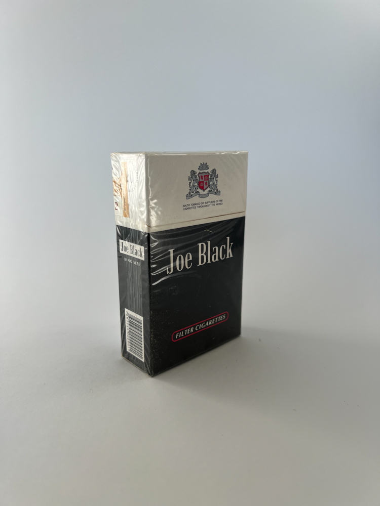 „The Joe Black cigarette pack has a classic and solid design – a black bottom with a bright white “Joe Black„ inscription and a cream-colored top. On the back, a coat of arms with the inscription “Baltic Tobacco Co. – Suppliers of fine cigarettes throughout the world„ is visible, indicating the export line. The pack has a Russian excise stamp, indicating that this unit was intended for the domestic market. The aesthetically clean design with the red “Filter Cigarettes„ inscription gives an image of Western quality.
