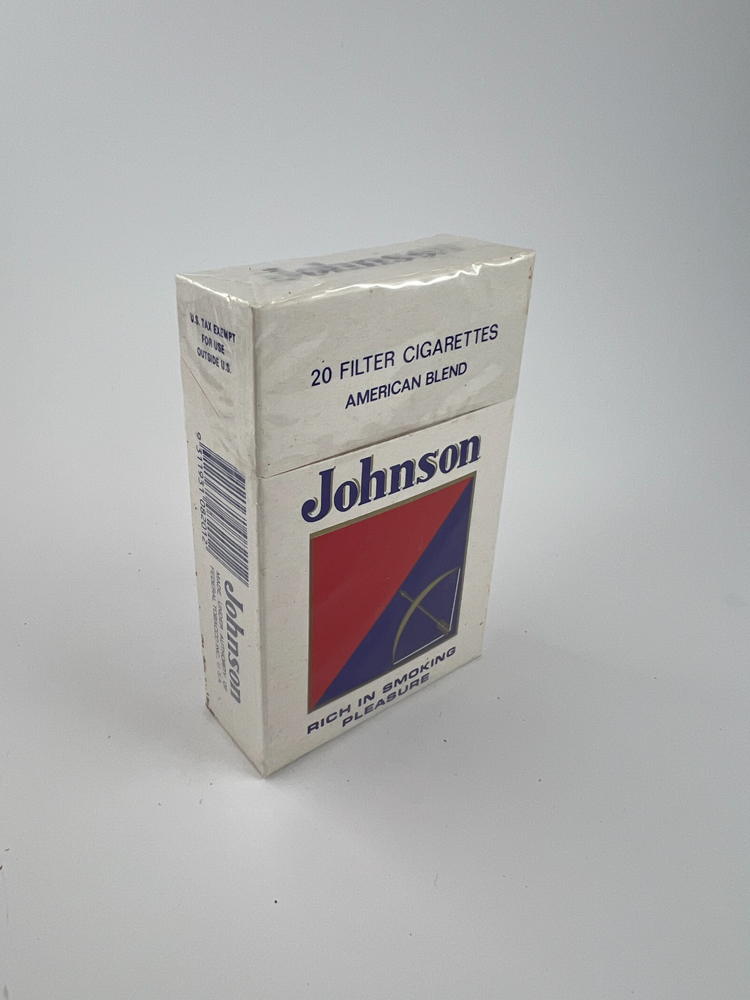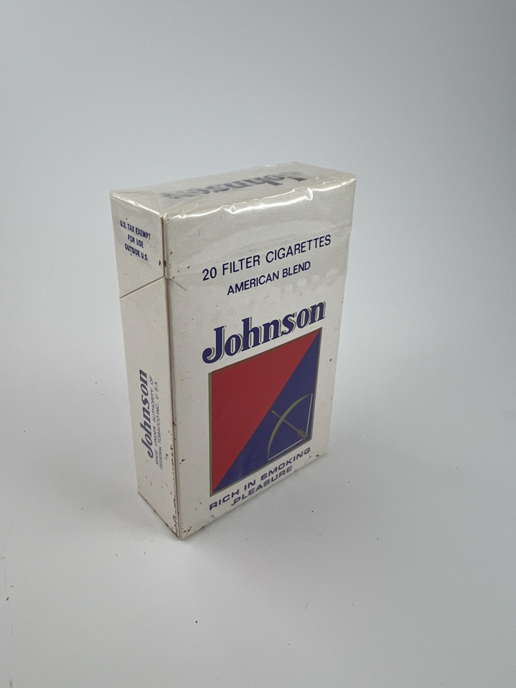 Description: This Johnson cigarette pack has a minimalist design – a white background with a red and blue graphic accent in the center. The pack states that the cigarettes are of the „American Blend“ type and are intended for export („Tax Exempt – For Use Outside USA“), which means that this product was not intended for the US domestic market. At the bottom is the phrase „Rich in Smoking Pleasure“, typical of advertising aimed at export markets.