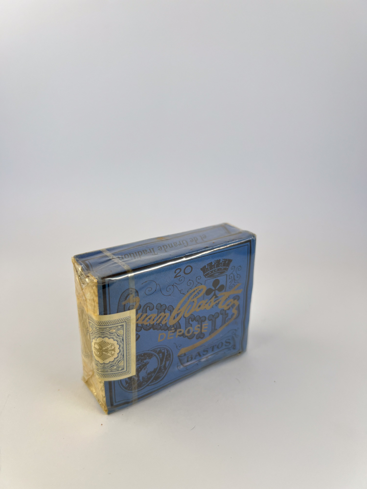 Juan Bastos "Depose" is a classic Belgian cigarette pack, featuring a distinctive blue design with gold ornaments and an antique font. It is a typical example of post-war European tobacco packaging, reflecting an elegant and luxurious image. The front of the pack features the decorative Bastos coat of arms, a crown and the inscription In depots, indicating a registered trademark.