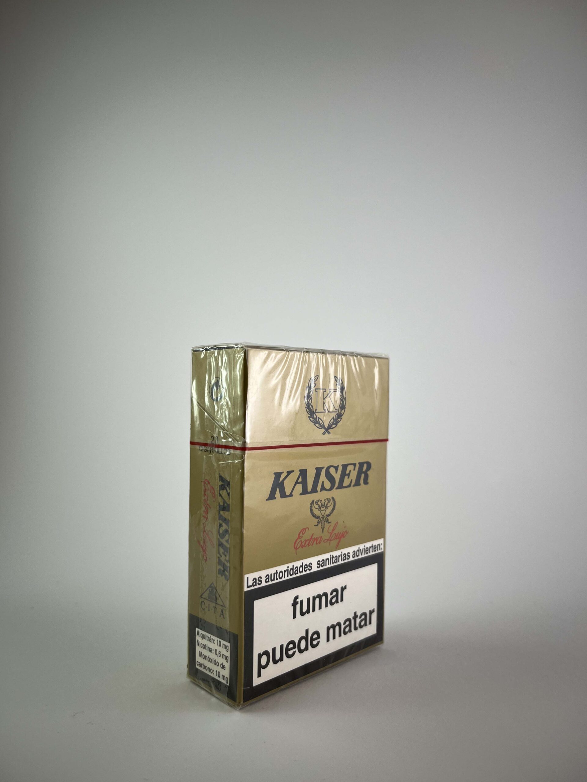 Description: This Kaiser Extra Lujo The cigarette pack features a luxurious gold design that gives the impression of sophistication and elegance. The pack is decorated with subtle logos and a red ribbon that highlights the brand identity. Warnings about the harms of smoking are clearly visible, as required by EU standards. This pack seems to be intended for those who value high-quality tobacco and solid design.