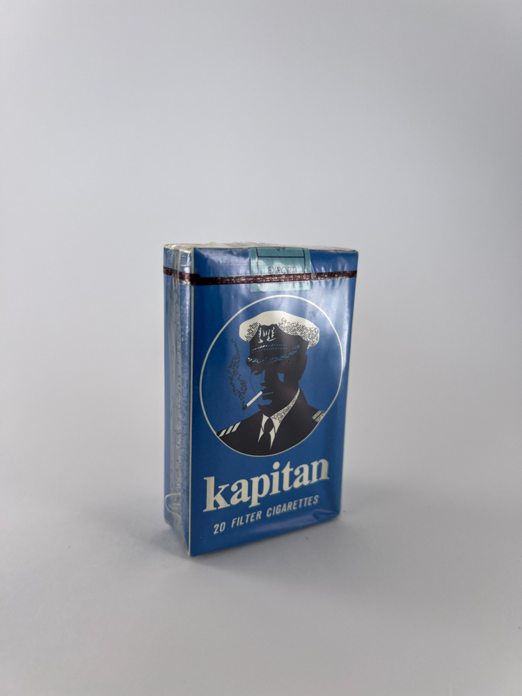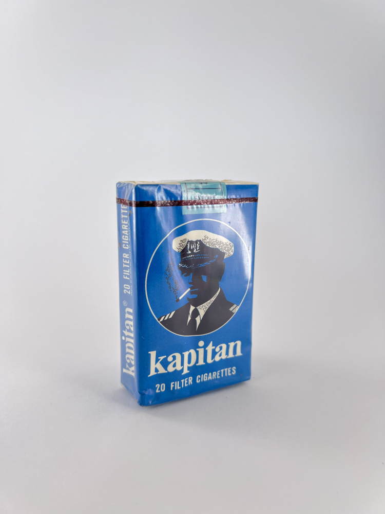 „"Kapitan" is an old Polish cigarette brand, the name of which means "captain". The pack has a bright nautical motif: a blue background, a stylized image of a captain with a cigarette-smoking character in the center. This is an export version - this is indicated by the English inscriptions "20 filter cigarettes", intended for the international market. The design is minimalist, but very recognizable and stands out among the products of the Soviet bloc.