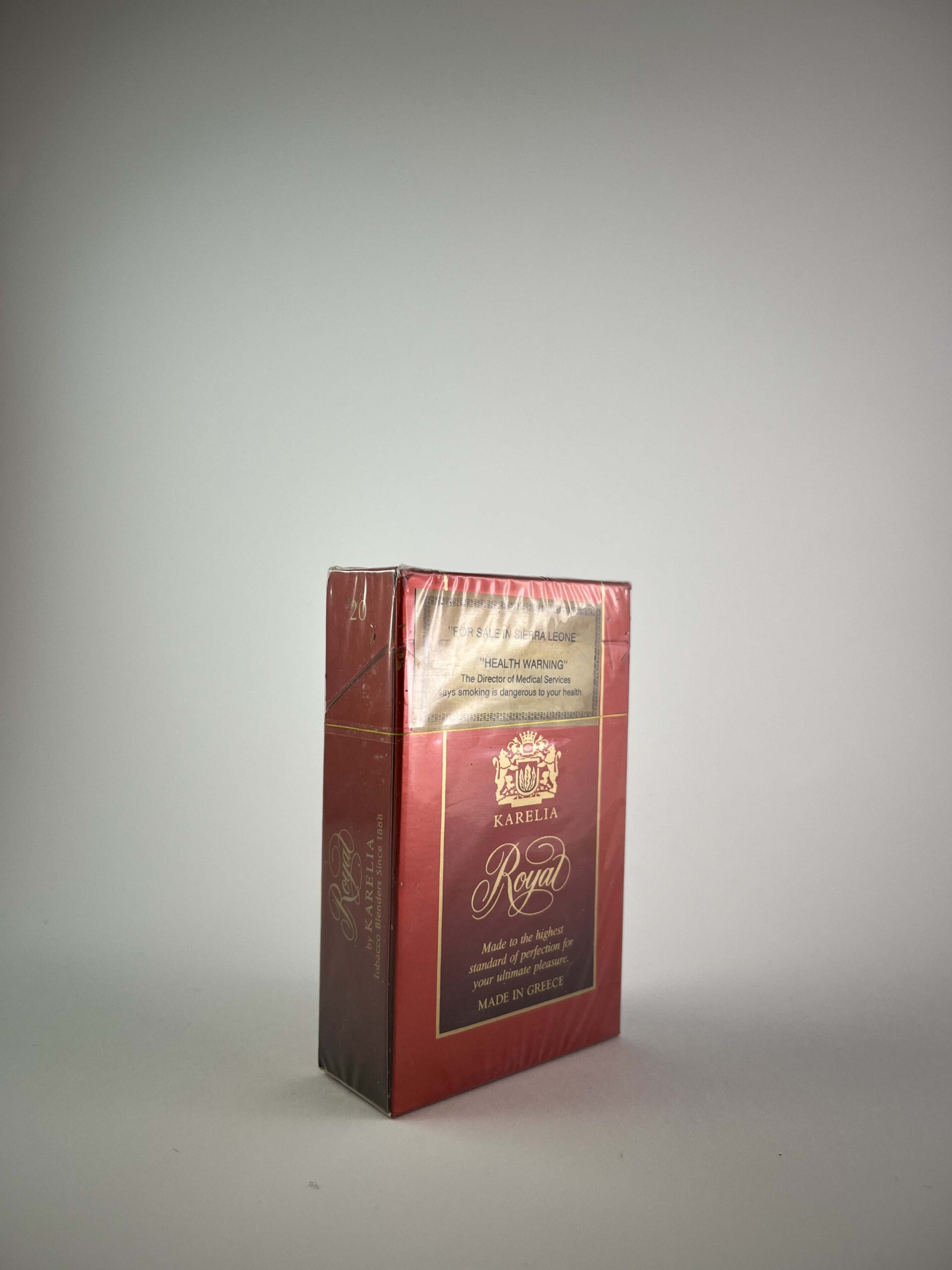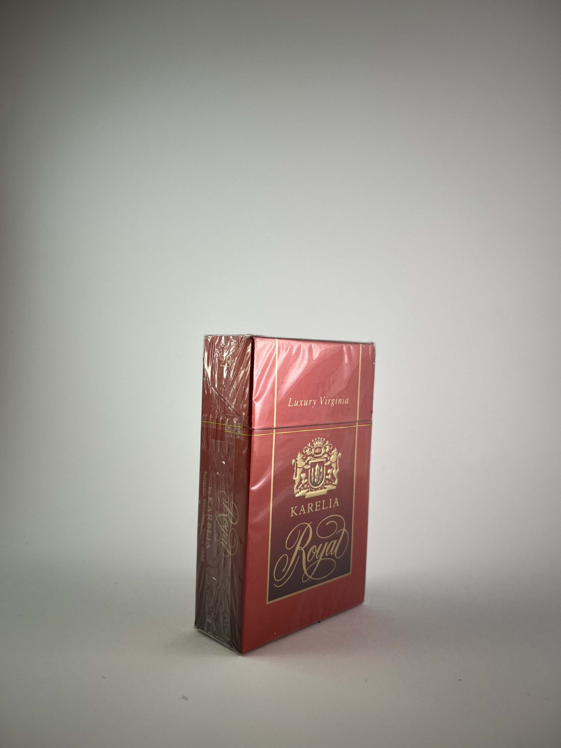 Description: This pack of Karelia Royal Luxury Virginia cigarettes features a luxurious design, featuring a rich red color, gold lettering and a decorative brand name. The pack proudly mentions its origin – Greece, which is famous for its tobacco production traditions. The inscription „Luxury Virginia“ indicates the high quality tobacco used in these cigarettes. The pack is in undamaged condition, with original packaging and a health warning in English, intended for a specific market.