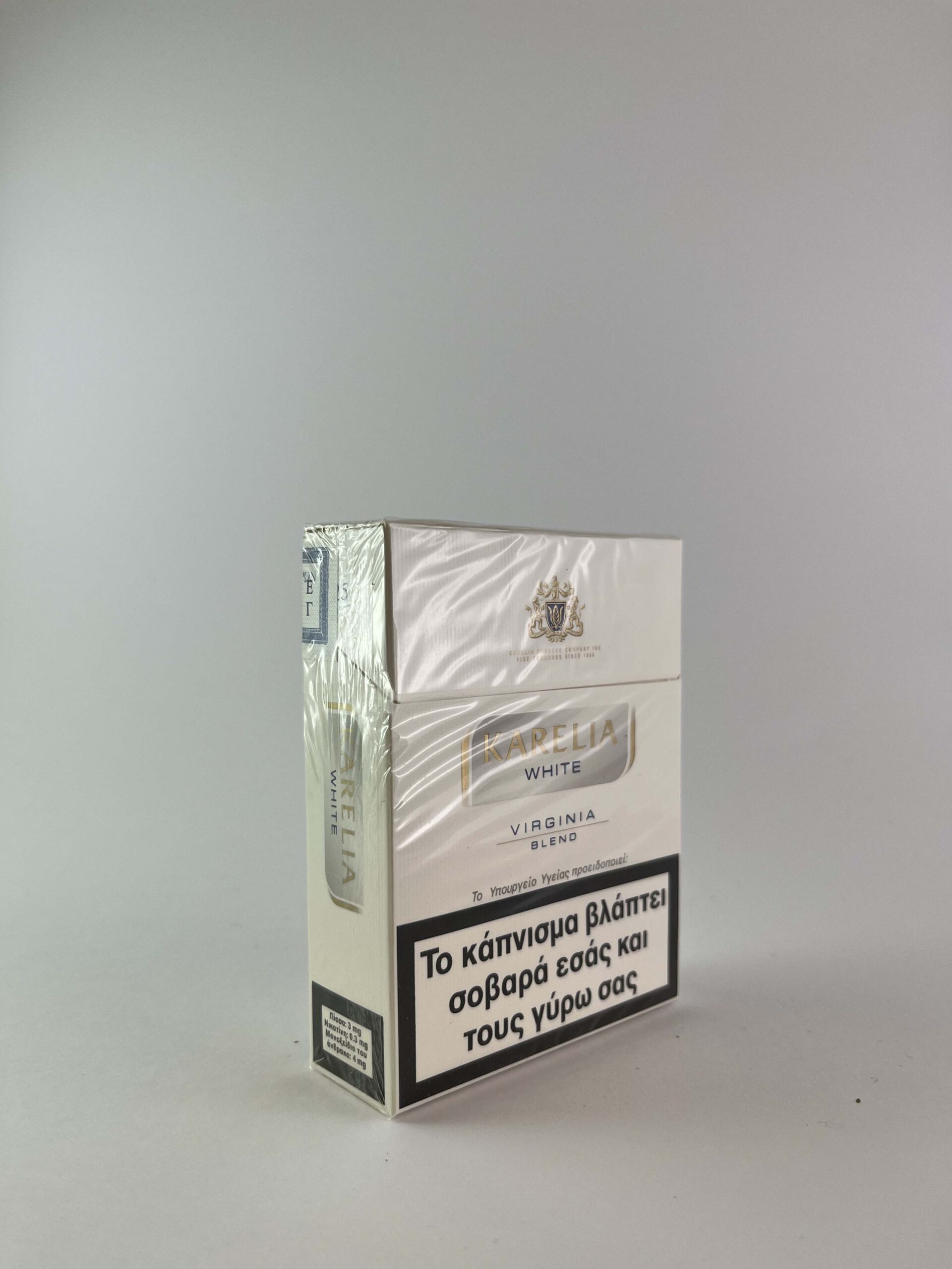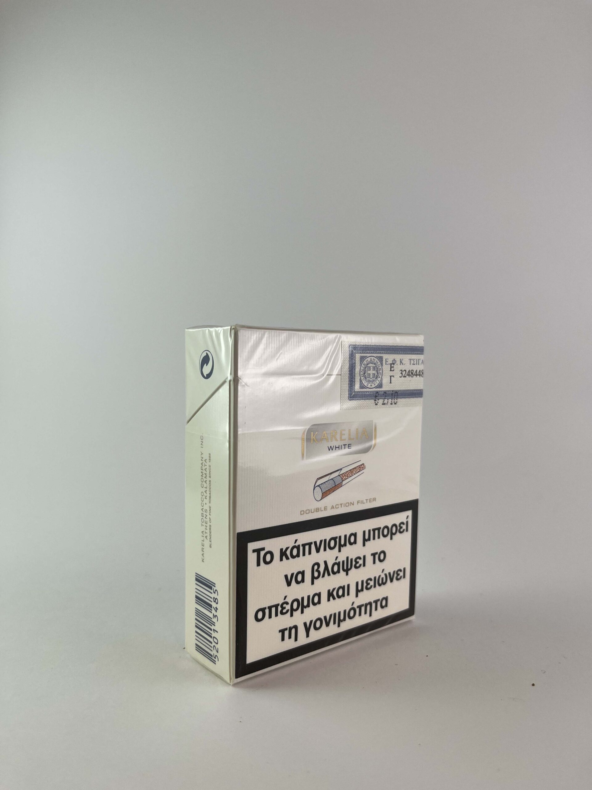 Karelia White Virginia Blend features a clean and minimalist design with subtle white and silver accents. The pack is elegantly laid out, with clear brand logos and smoking warnings taking up a large portion of the pack. The Double Action Filter emphasizes the quality and modernity of the product. Karelia Tobacco Company is known for its high-quality tobacco products, which are appreciated both in Greece and abroad.