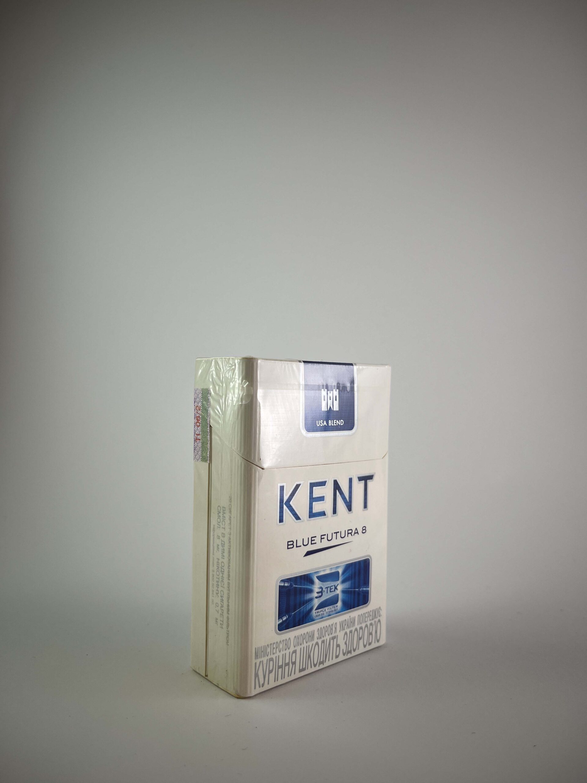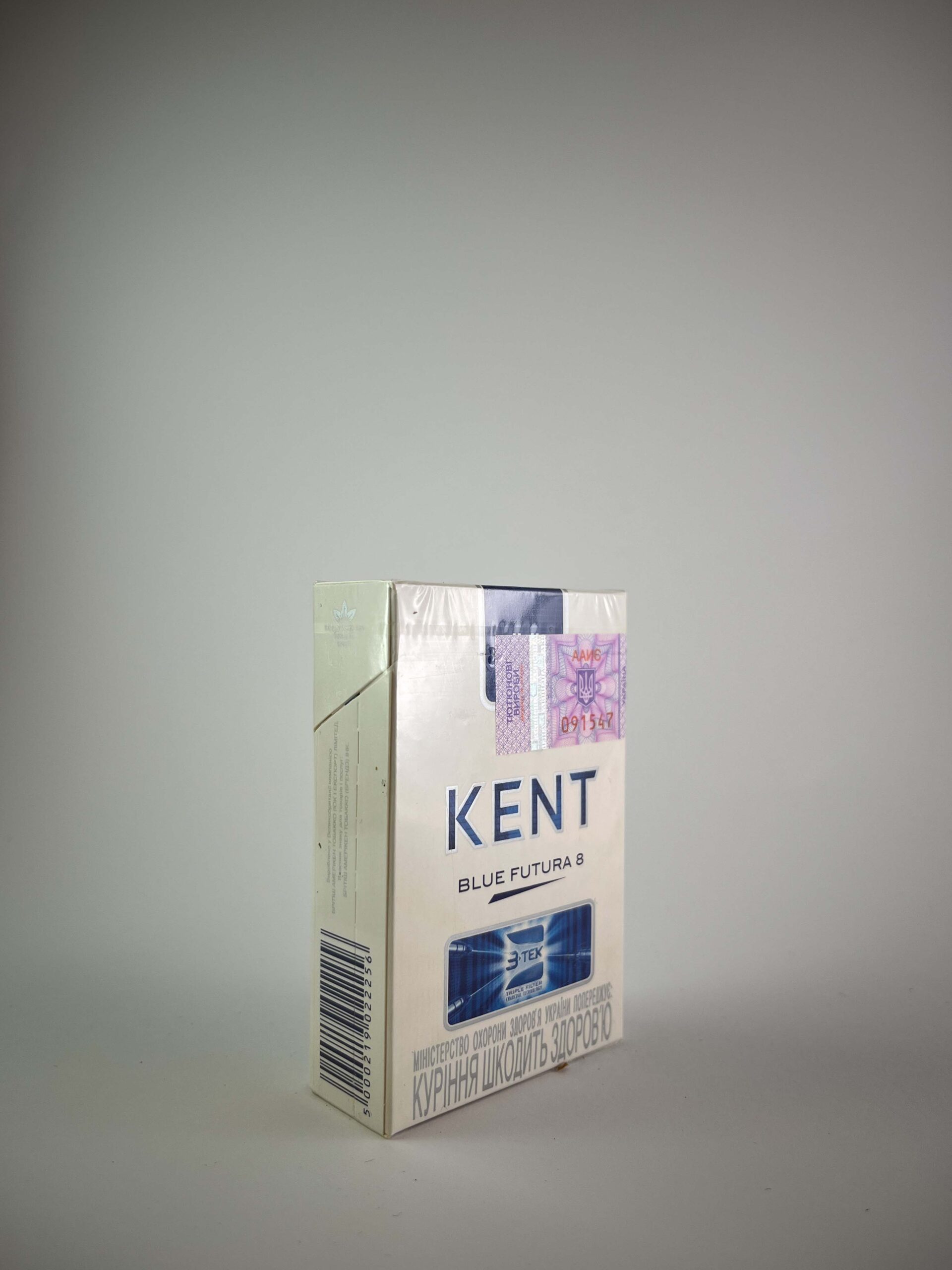 Description: Kent's Blue Futura 8 pack features a modern and clean design, dominated by white with blue accents. The packaging highlights the USA Blend tobacco, which emphasizes the international image of the brand. At the bottom of the package is a warning about the harms of smoking in Ukrainian, and an excise stamp indicates that the product was intended for the Ukrainian market. The Blue Futura series usually emphasizes a milder taste and lower tar content.