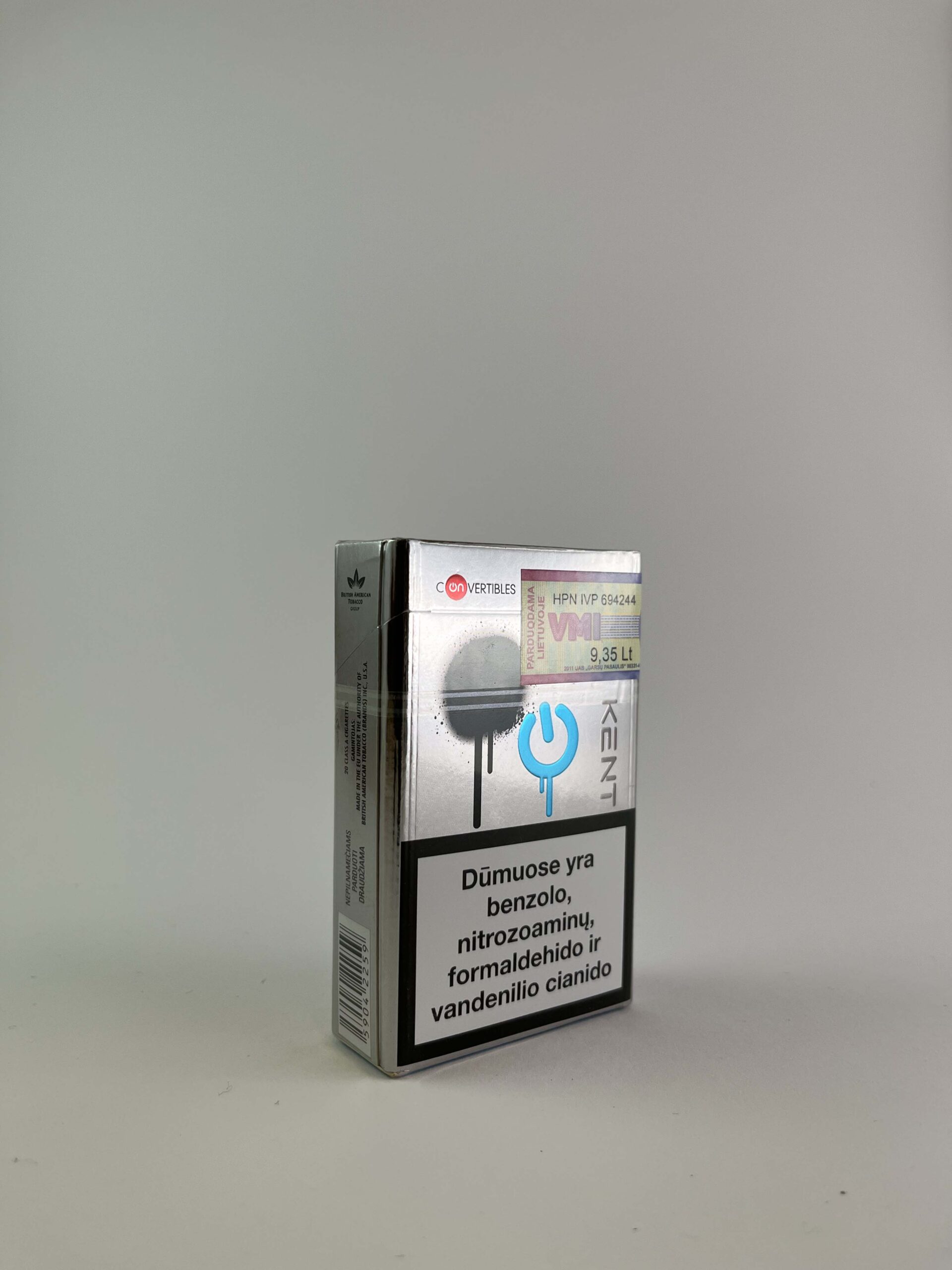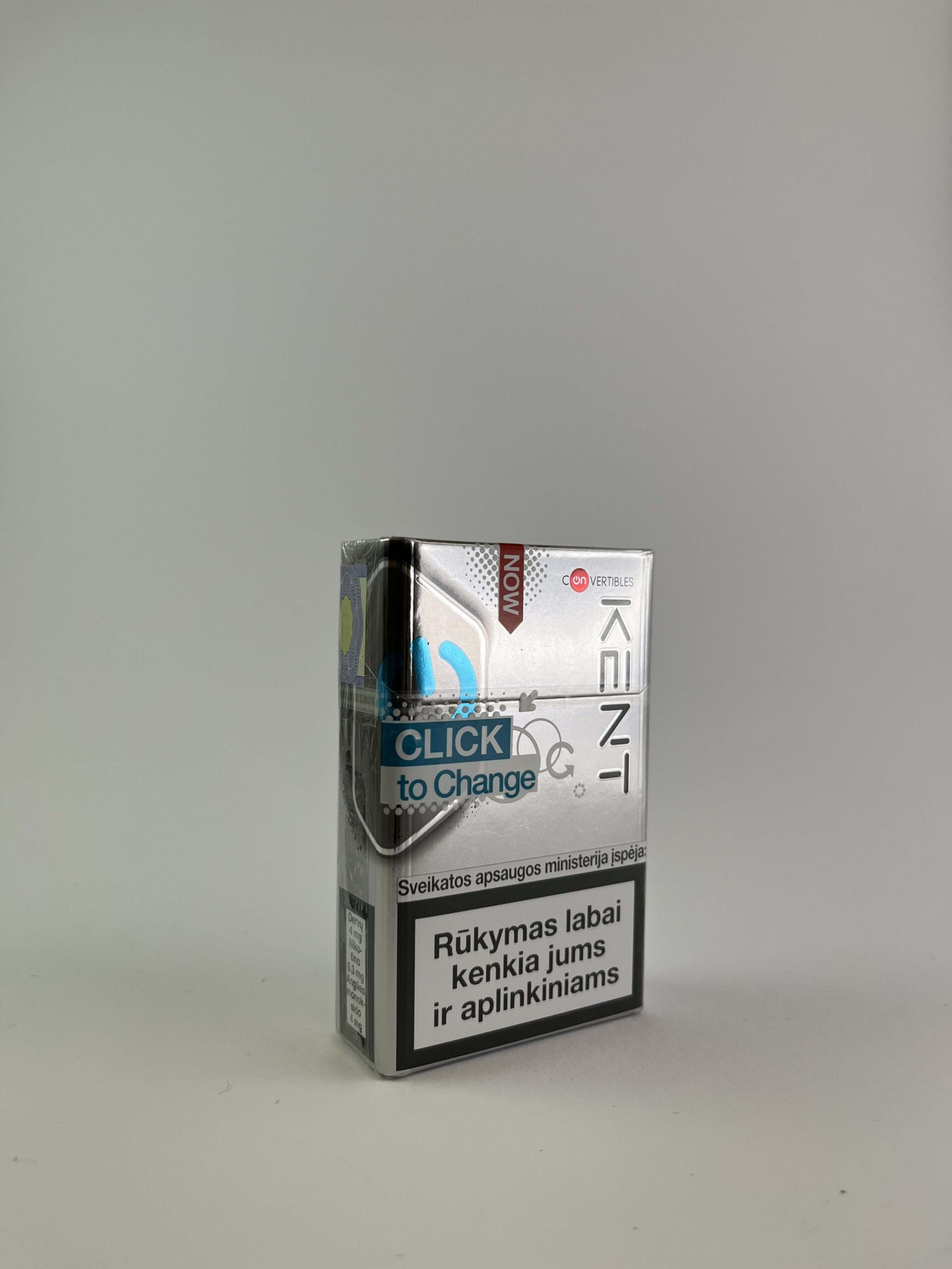 Description: This Kent Convertibles cigarette pack with Click to Change technology allows the user to change the flavour with a built-in button on the pack. The design features a silver background and blue accents that highlight the brand and the product's innovation. This pack is designed for those looking to personalise their smoking experience.
