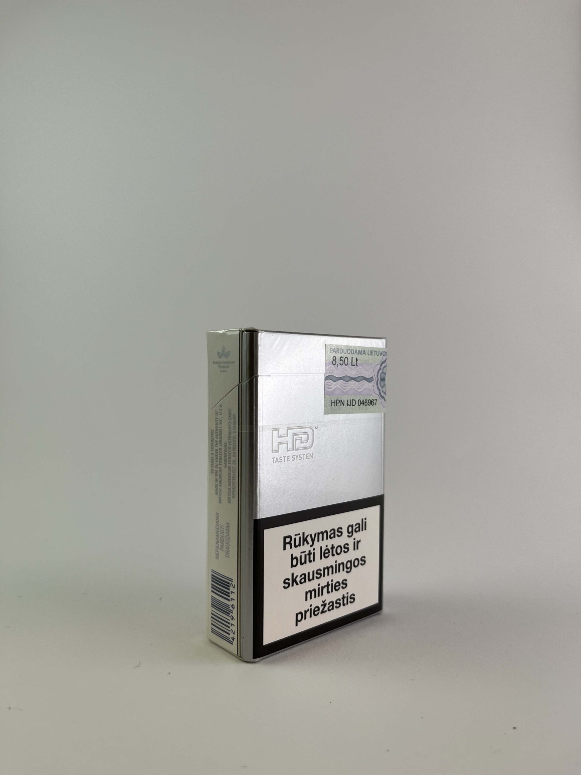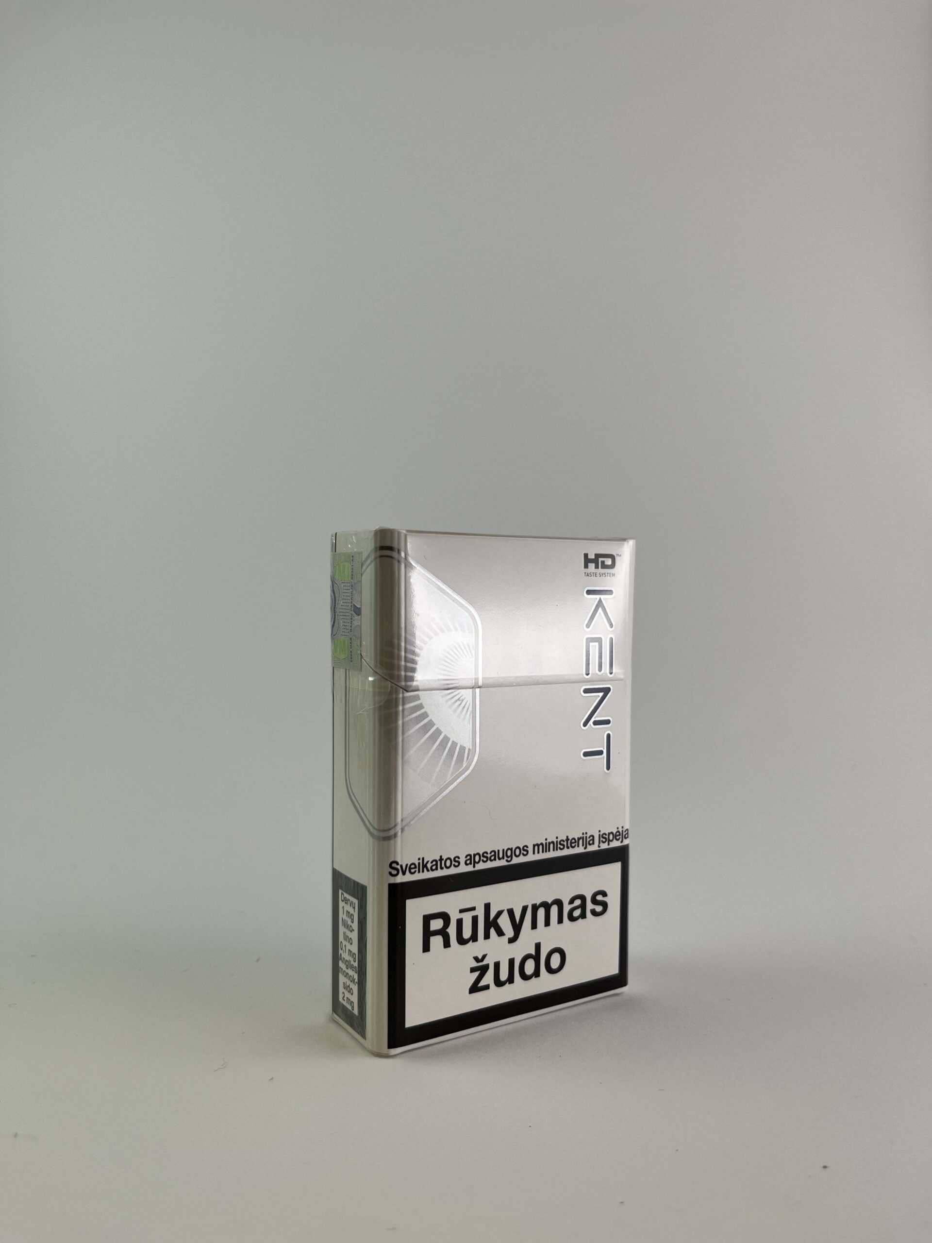 This Kent „HD Silver” cigarette pack features a modern and minimalist design, dominated by silver color with subtle logos and the „HD Taste System“ inscription, which refers to the exclusive flavor extraction system. On the front and back, there are clearly presented warnings about the harm of smoking, expressed in simple but compelling slogans, for example, „Smoking kills“. The pack is intended for the Lithuanian market, as indicated by the inscription „Sold in Lithuania“ and the price – LTL 8.50.