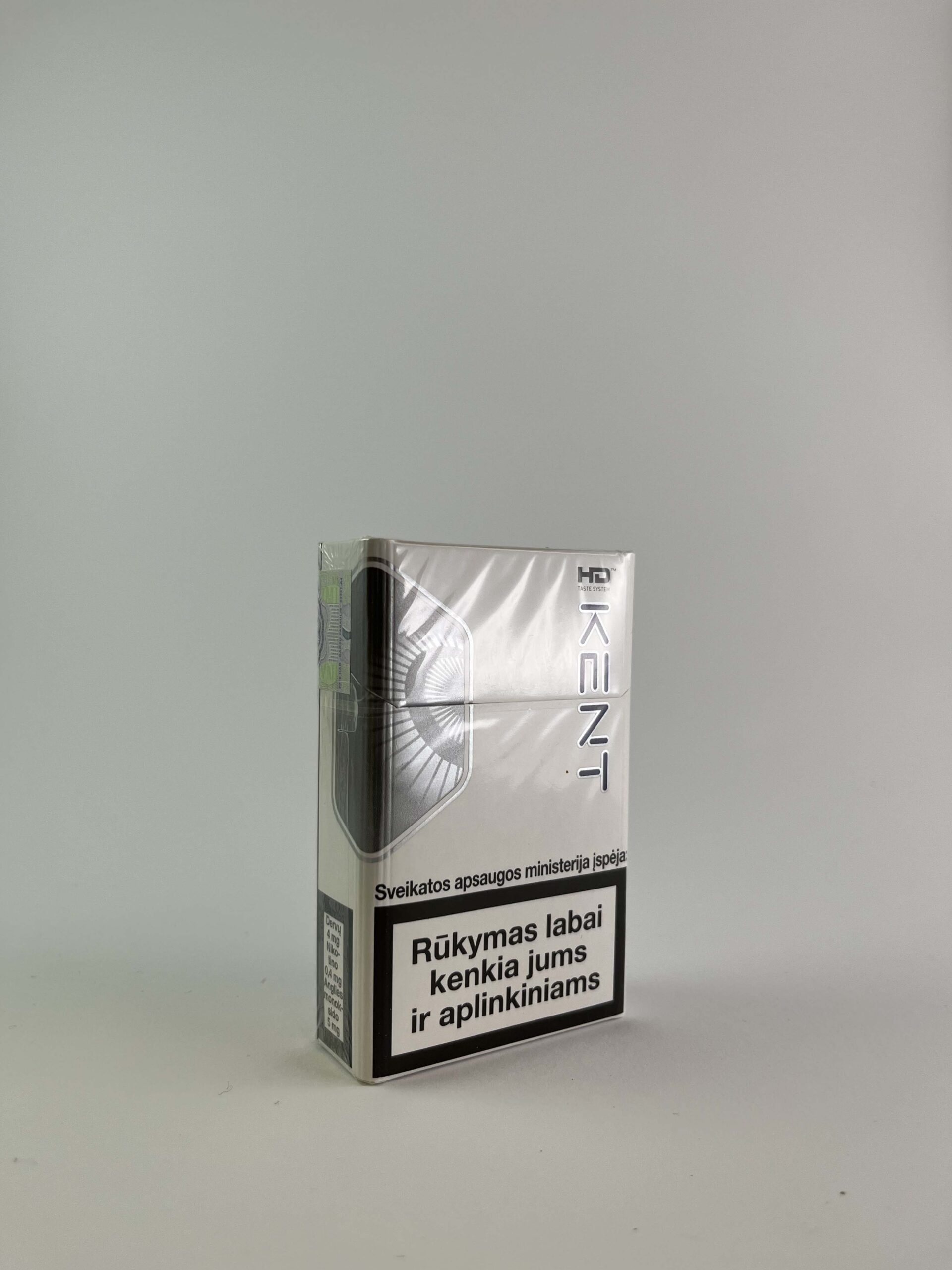 Description: This Kent HD Silver cigarette pack features a modern and minimalist design with a silver background. The pack has a warning about the health risks of smoking and is marked with the Lithuanian excise stamp, indicating the selling price (8.75 LTL). The design features HD Taste System technology, emphasizing quality and smooth taste.