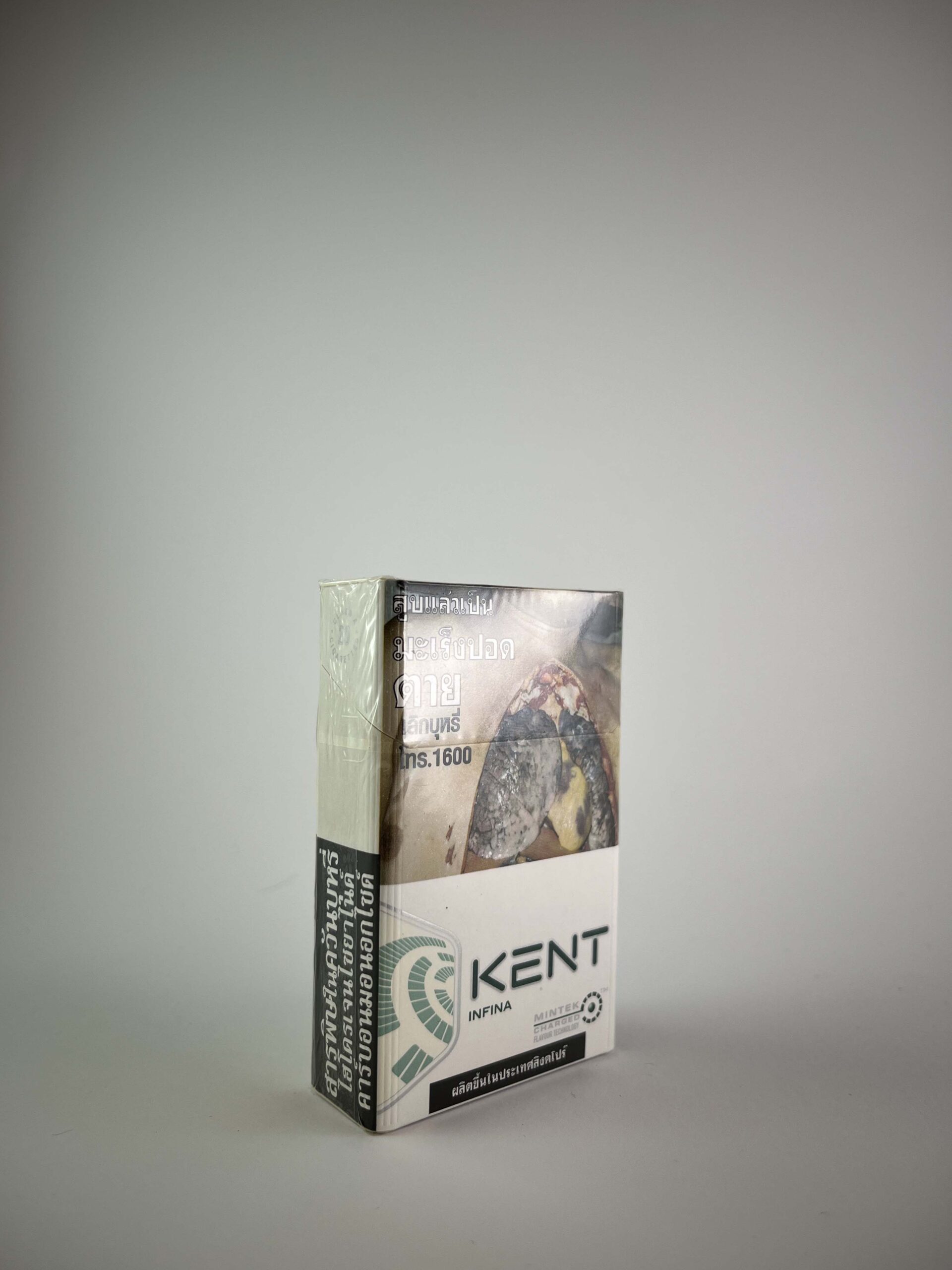Description: This pack of Kent Infina cigarettes is distinguished by its minimalist and modern design. The packaging is decorated with bright warning pictures that emphasize the health risks of smoking. The pack is made in Thailand and its design complies with local laws on warnings about the harms of smoking. It uses Mintek technology, which emphasizes an innovative approach to tobacco production.