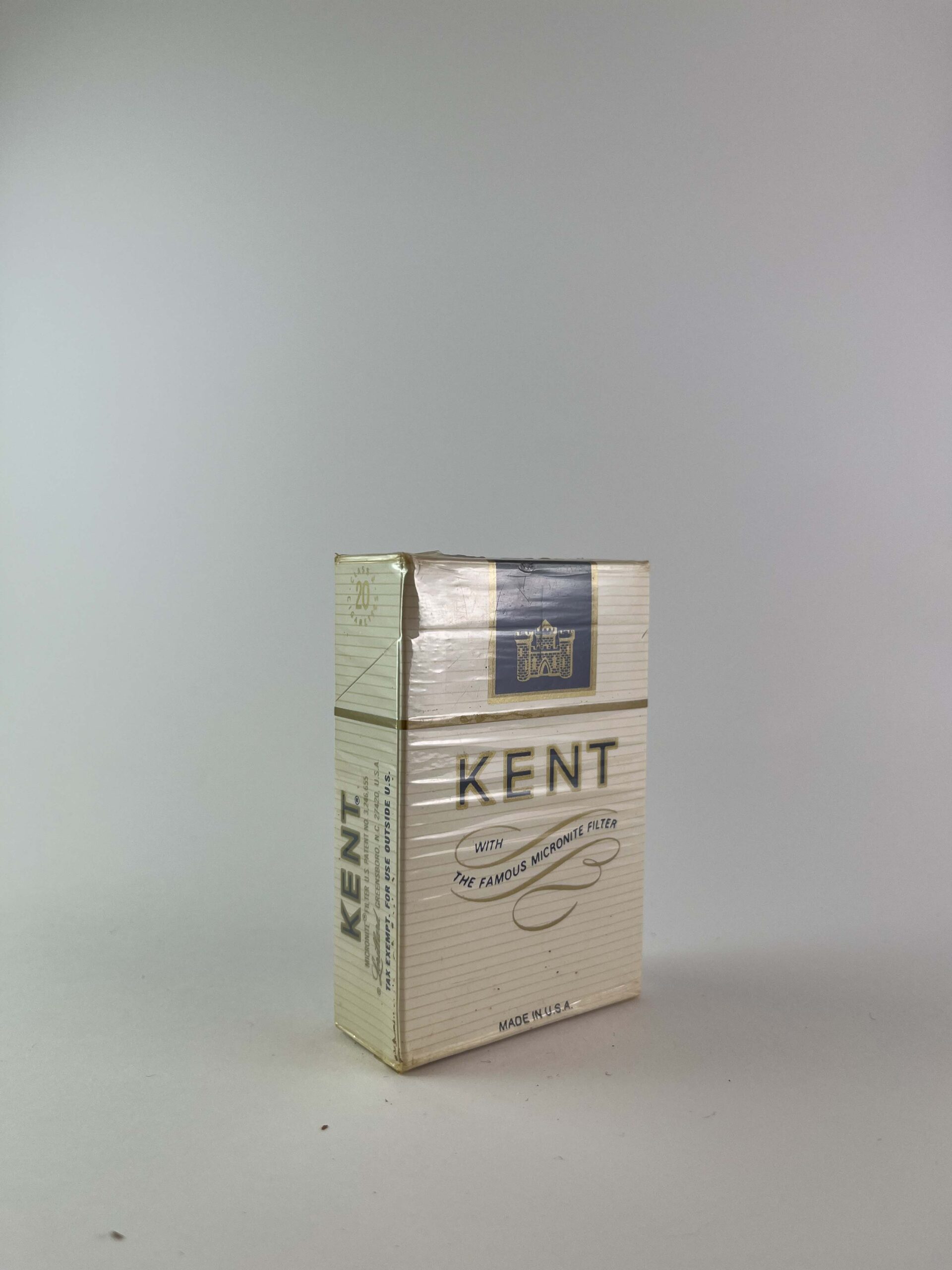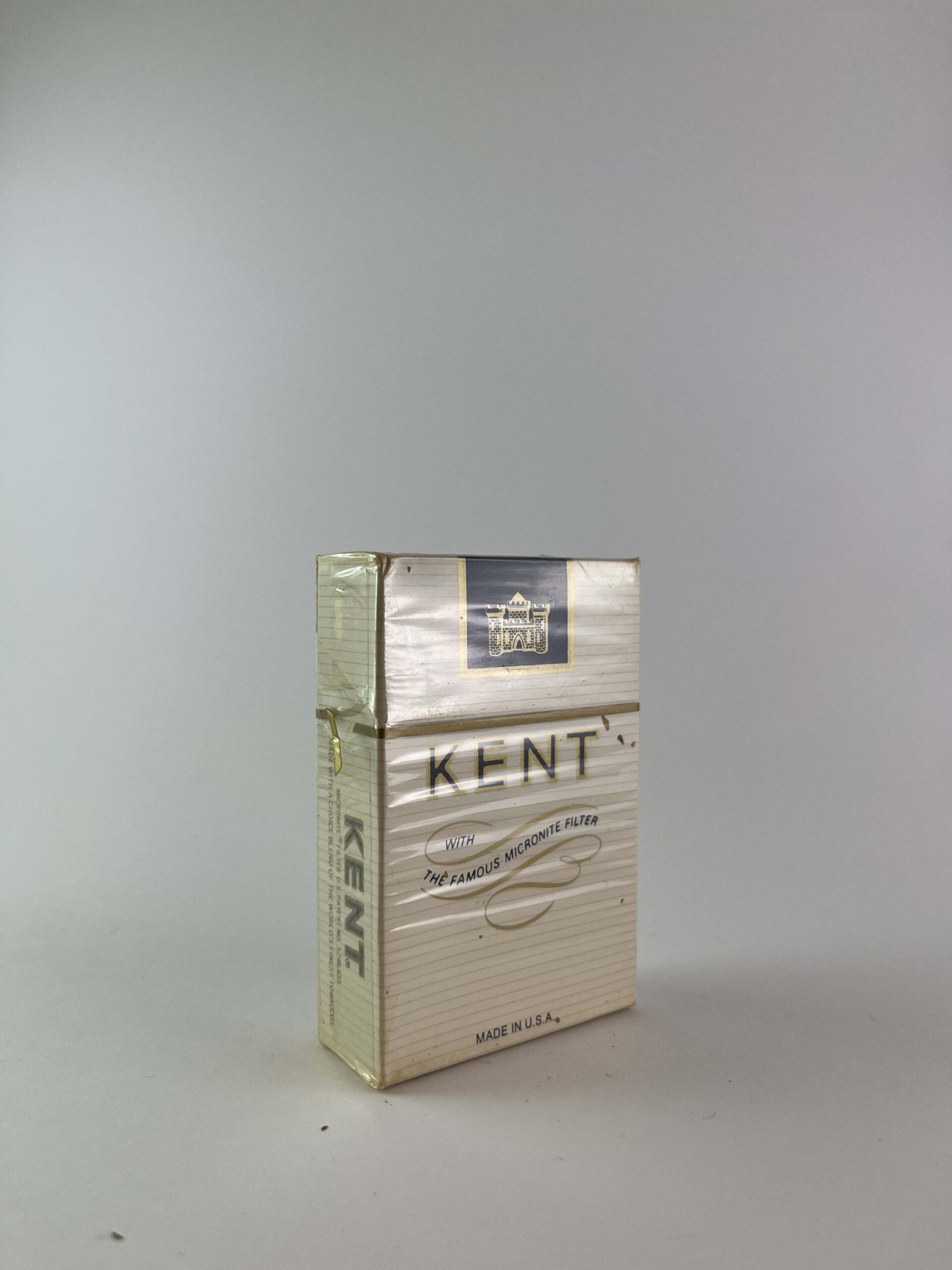 Description: This Kent cigarette pack has an elegant and subtle design, with a white base and a minimalist logo. The Micronite Filter highlights the filter that was a hallmark of Kent cigarettes in the old days. The design is clean and crisp, with subtle gold lines that add a touch of luxury.