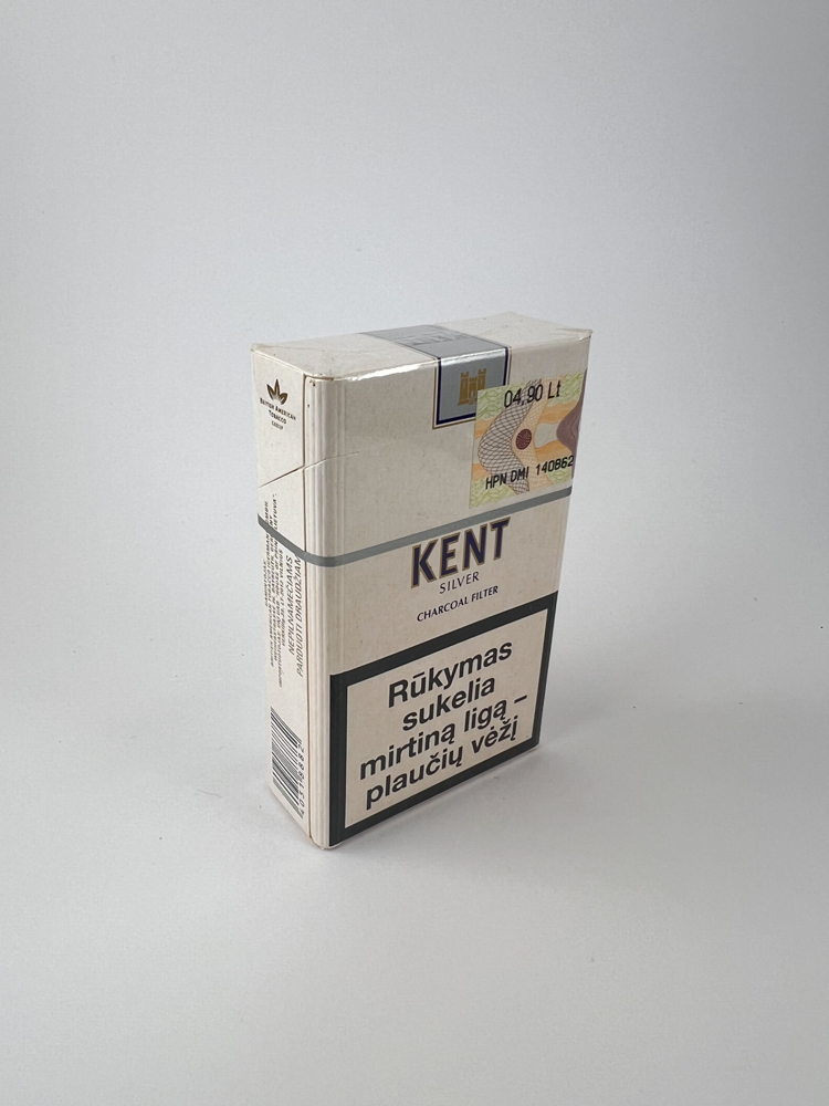 Description: Kent „Silver“ serijos pakelis pasižymi minimalistiniu, šviesiai sidabriniu dizainu su tamsiai mėlynais akcentais. Viršuje matomas Kent herbas, o apačioje – perspėjimai apie rūkymo žalą. Ši versija turi „Charcoal Filter“ užrašą, nurodantį aktyvintos anglies filtrą. Pakelis pažymėtas lietuviška banderole su kaina 4.90 Lt, kas padeda nustatyti jo prekybos laikotarpį. Įspėjimai pateikti senąja stiliaus forma, o tai taip pat patvirtina ankstyvą leidimą prieš pilnus ES reikalavimus.