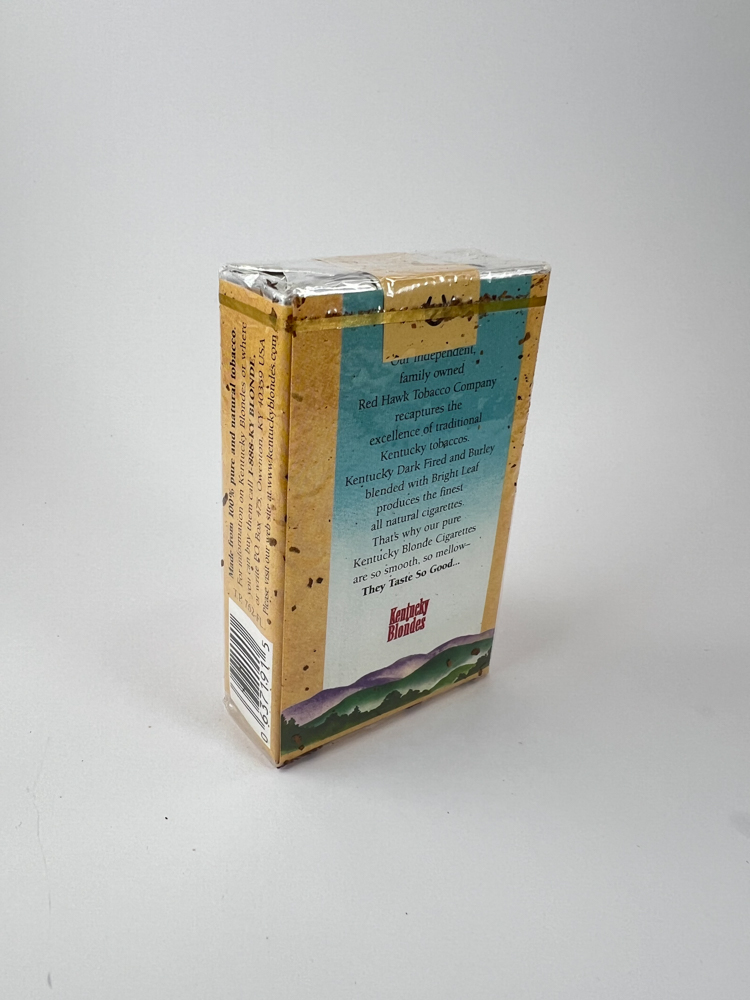 This pack of Kentucky Blondes is a product of the natural tobacco line, emphasizing the concept of "all natural cigarettes". The design clearly reflects the cowboy spirit of America - a running horse is depicted on the front, and a horseshoe on top. The colors of the package are yellowish brown with a bluish-green background. The back describes that the manufacturer - the independent Red Hawk Tobacco Company - made these cigarettes from Kentucky Dark Fired and Burley tobacco mixed with Bright Leaf. A mild, natural taste is advertised. This is a rather rare product from a regional US manufacturer, more focused on a niche market looking for "additive-free" tobacco.
