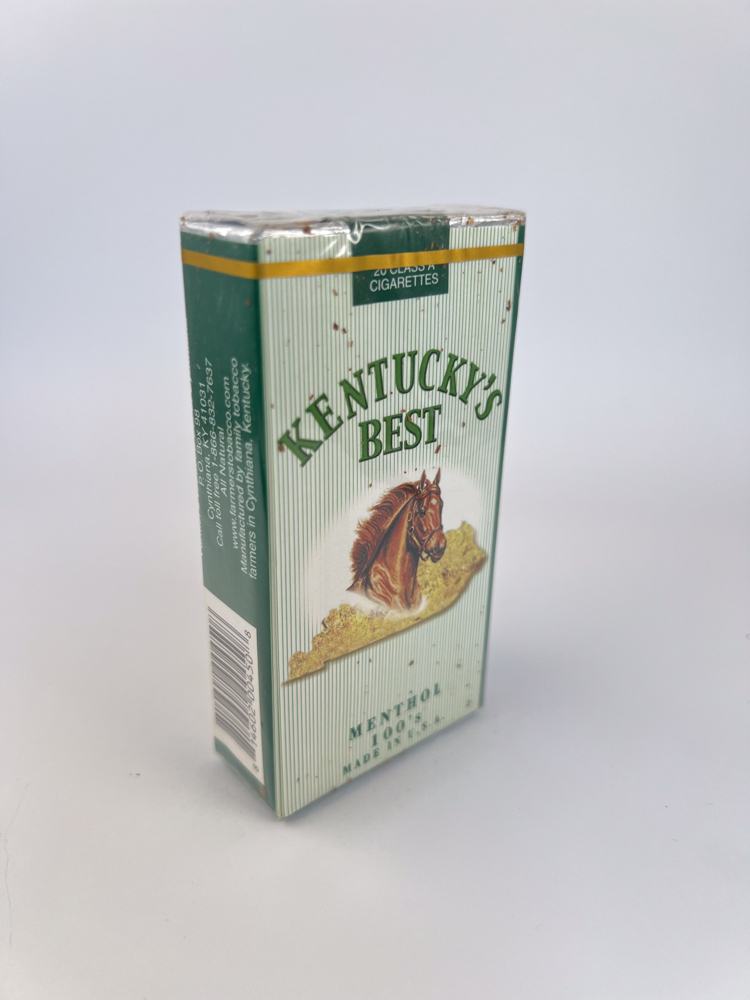 A classic American-style package, decorated with a light green background with vertical stripes and a subtle gold border. In the center is depicted horse on a background of tobacco leaves, symbolizing the traditions of the state of Kentucky - tobacco growing and horse racing. The name is written in curved letters at the top KENTUCKY'S BEST, and below it is indicated Menthol 100's and Made in USA.. Manufacturer information marked on the side – Commonwealth Brands Inc., known for its regional American tobacco products. The design is simple yet authentic – typical of the tobacco traditions of the southern states and the American aesthetic.