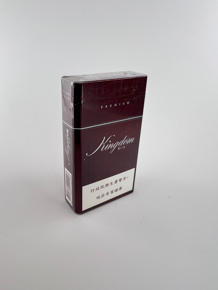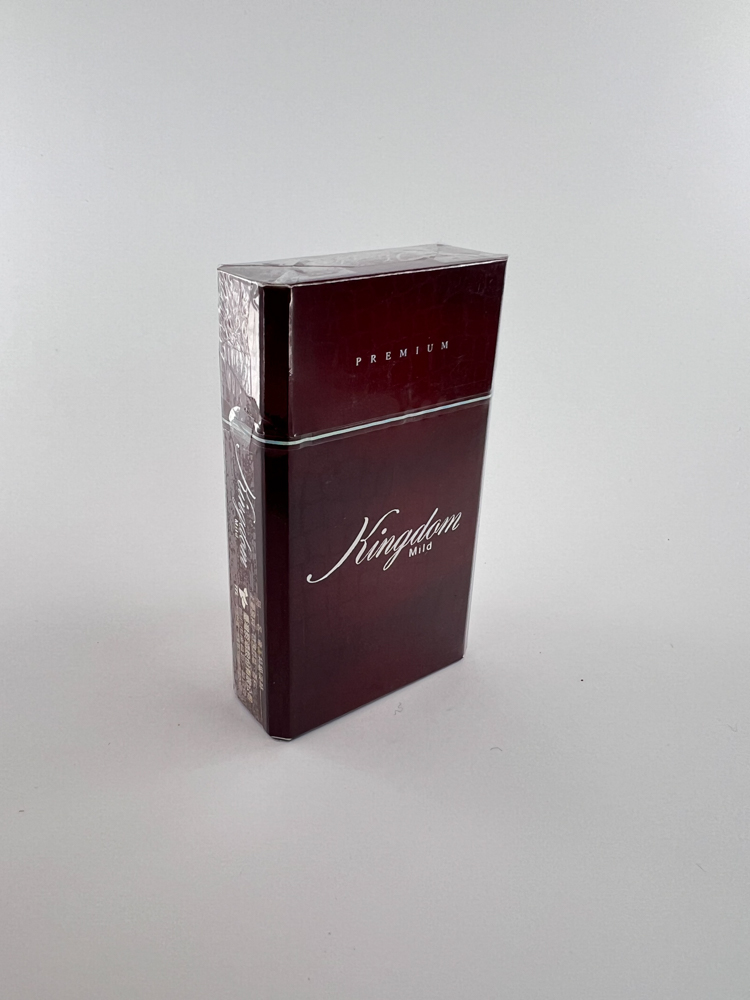Description: The Kingdom Mild Premium cigarette pack is distinguished by its dark burgundy color and minimalist design. The word „PREMIUM“ is printed at the top, and „Kingdom Mild“ is written in an elegant font in the center. The sides are decorated with additional information, including Chinese characters indicating that the pack was intended for the Asian market. The back side contains a warning about the harms of smoking, also in Chinese. Visually, the pack is oriented towards a classic, sophisticated style.