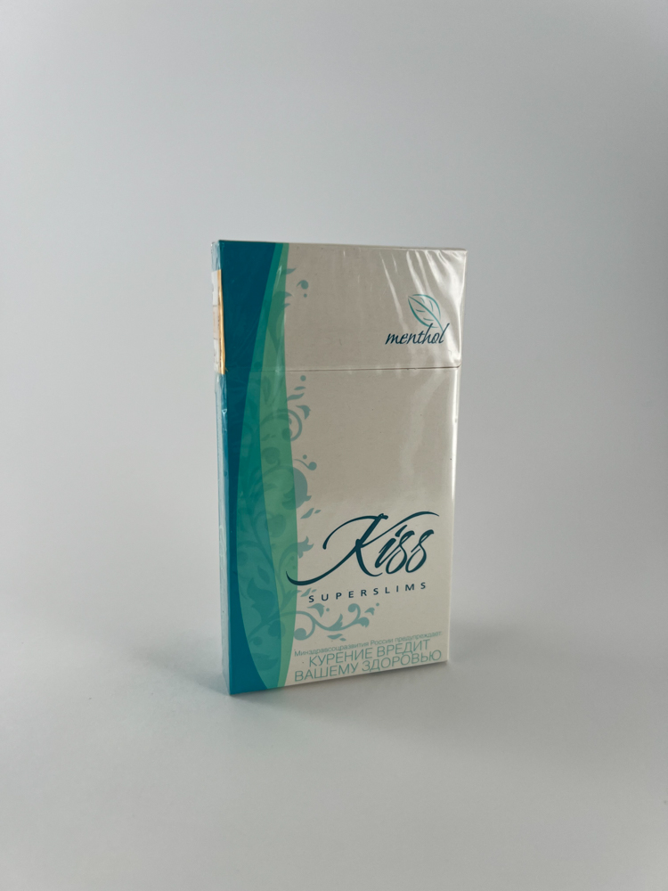 Kiss Superslims Menthol are thin menthol cigarettes designed for those looking for a light taste and a stylish image. The pack features an elegant and clean design with a greenish-blue ornamental accent, emphasizing the freshness motif. The word „menthol“ is marked at the top with a stylized leaf symbol. Superslims format packs are traditionally aimed at a female audience. The pack contains Russian-language warnings about the harms of smoking and a Russian excise stamp, indicating that the pack was intended for the domestic Russian market.