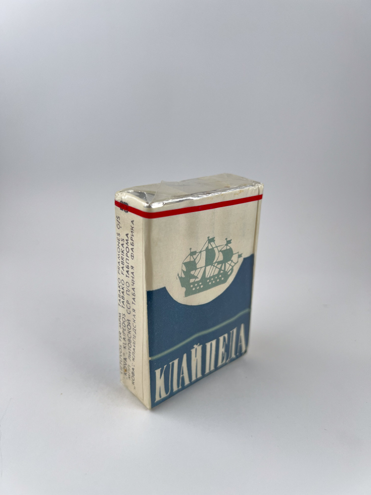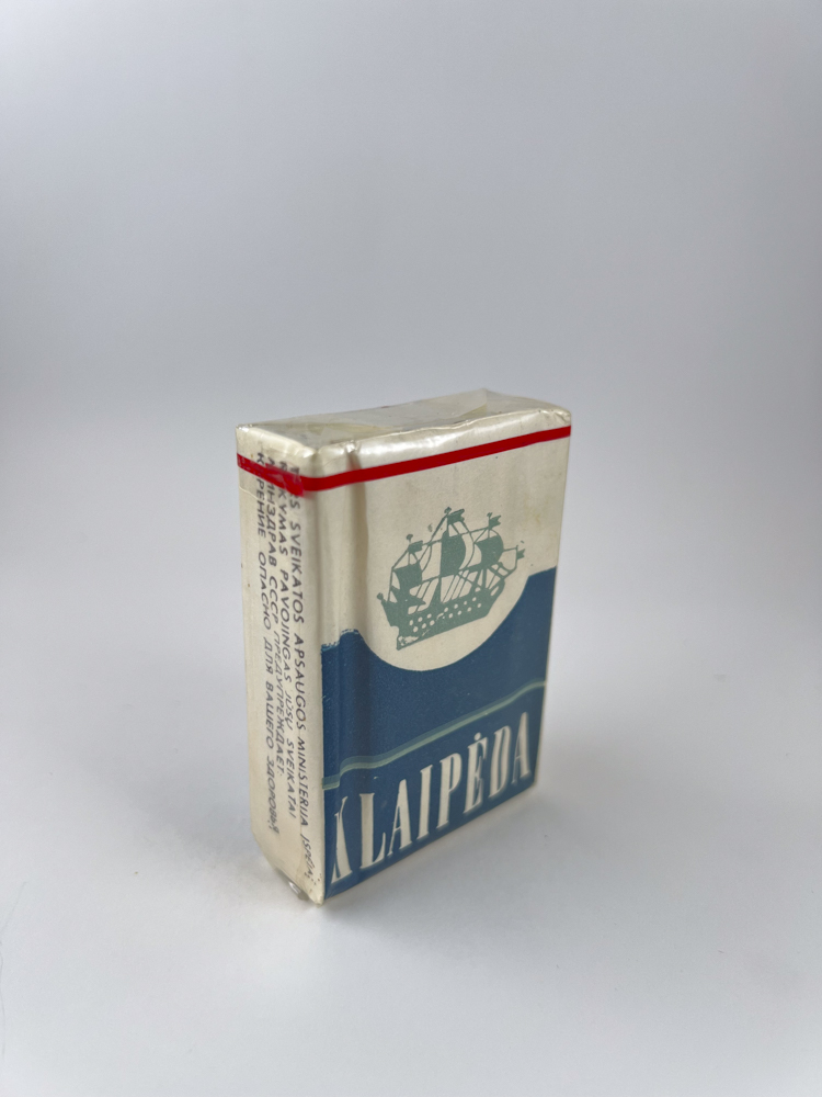 This is a classic Soviet-era edition of Klaipėda cigarettes, which already shows stabilized design language – light background, red horizontal line at the top and symbolic sailboat logo above the blue sea wave shape.