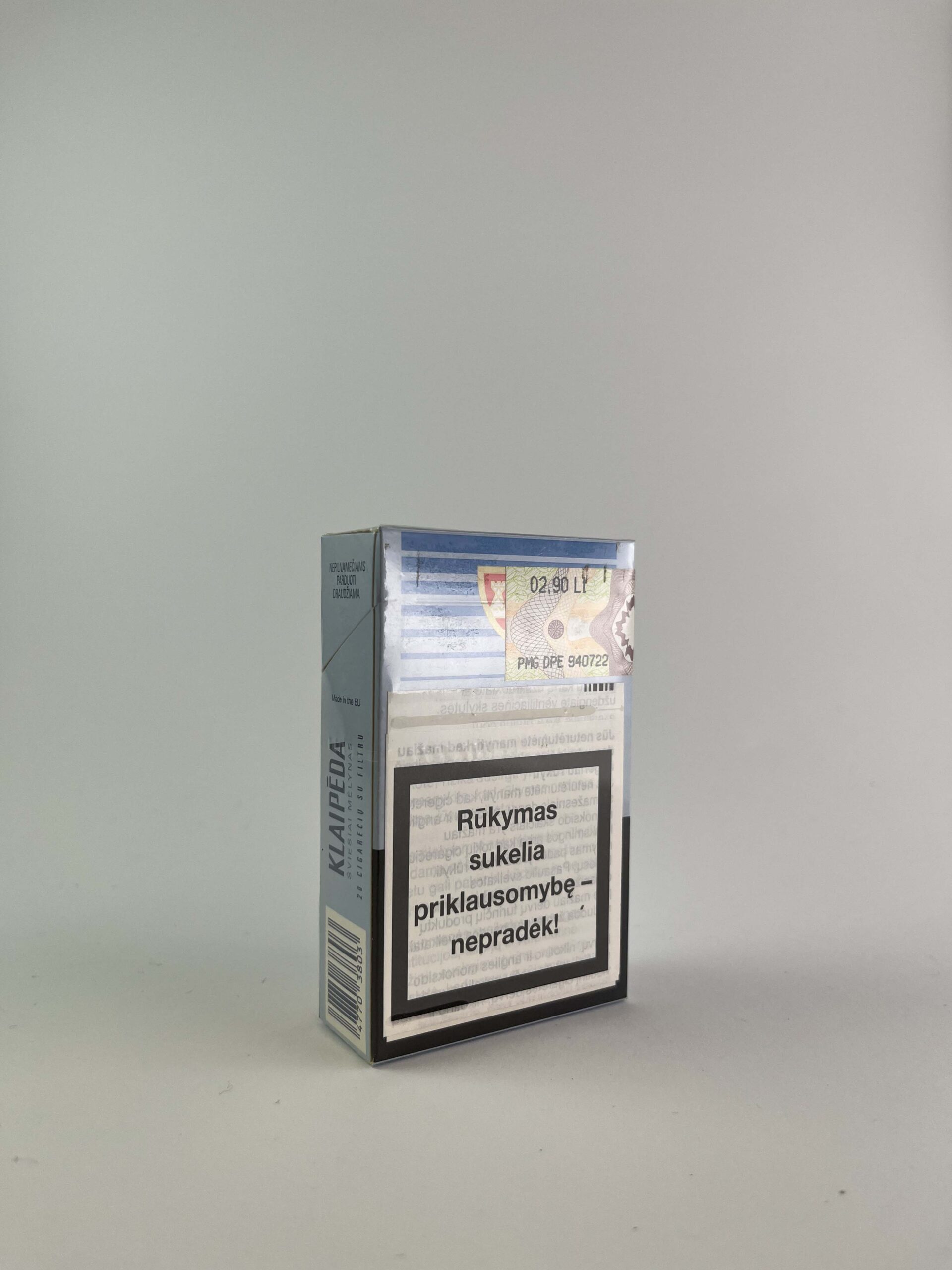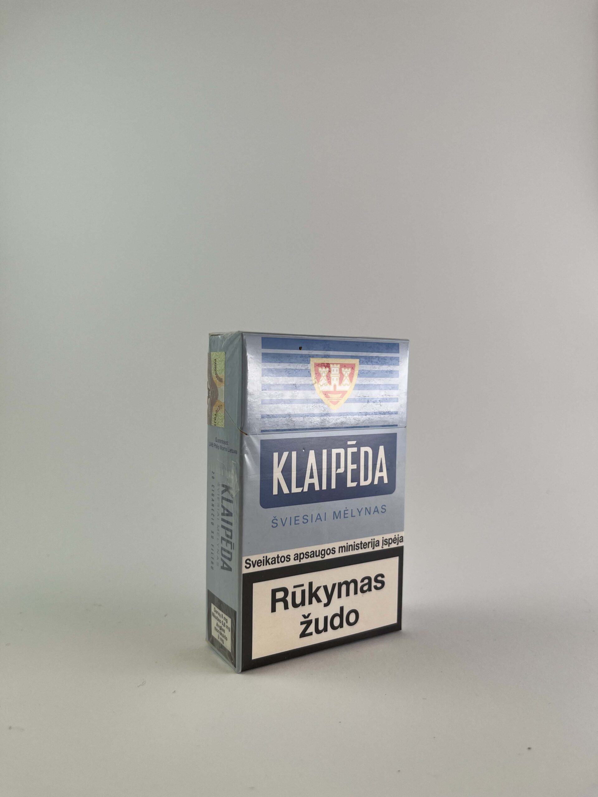 - Description: The pack is light blue with the Klaipėda city coat of arms, which reflects Klaipėda's cultural heritage. The inscription "Klaipėda" and the words "Light" on the pack refer to a milder version of the tobacco, and the design is minimalist, with a dominant combination of blue and white.