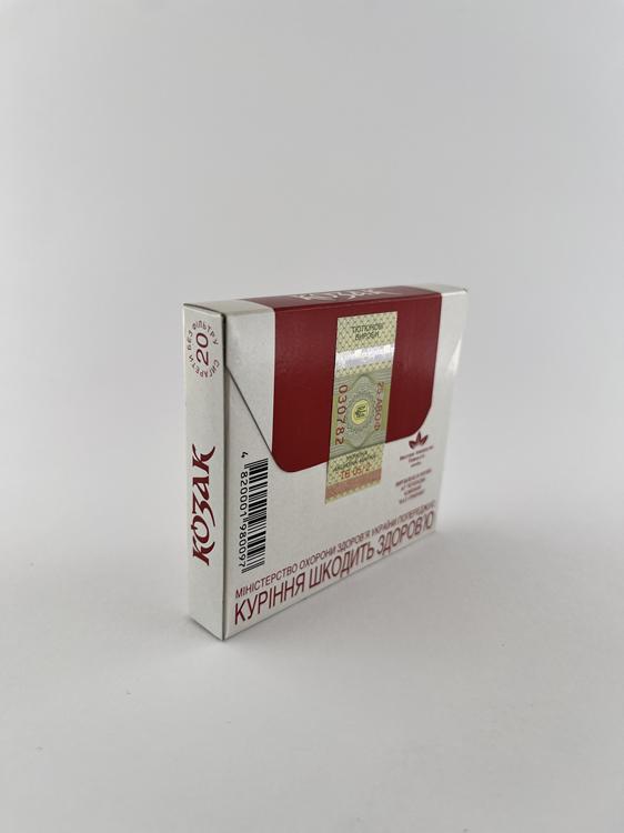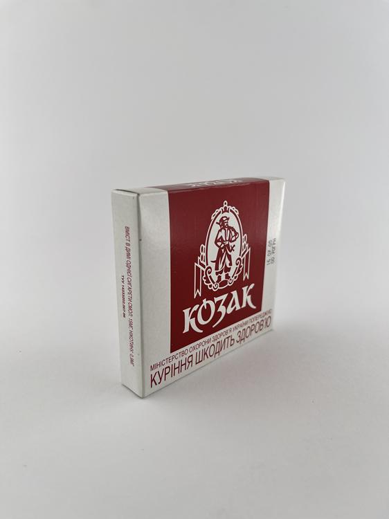 „Kozak“ – ukrainietiškas cigarečių prekės ženklas, kurio dizainas stipriai remiasi nacionaline simbolika. Ant pakelio pavaizduotas kazokas – istorinis Ukrainos identiteto simbolis, o pats pavadinimas „Kozak“ tiesiogiai tai atspindi. Dizainas minimalistinis: baltas fonas su raudonu centriniu bloku ir ryškiu logotipu.