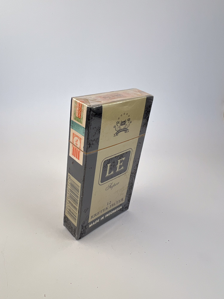 LE Super – classic mid-range Indonesian kretek A package whose design combines elegance and simplicity. At the top is a monogram logo with letters LE., and the background of the package is a soft, champagne-colored background, framed by a dark gray, almost metallic frame.