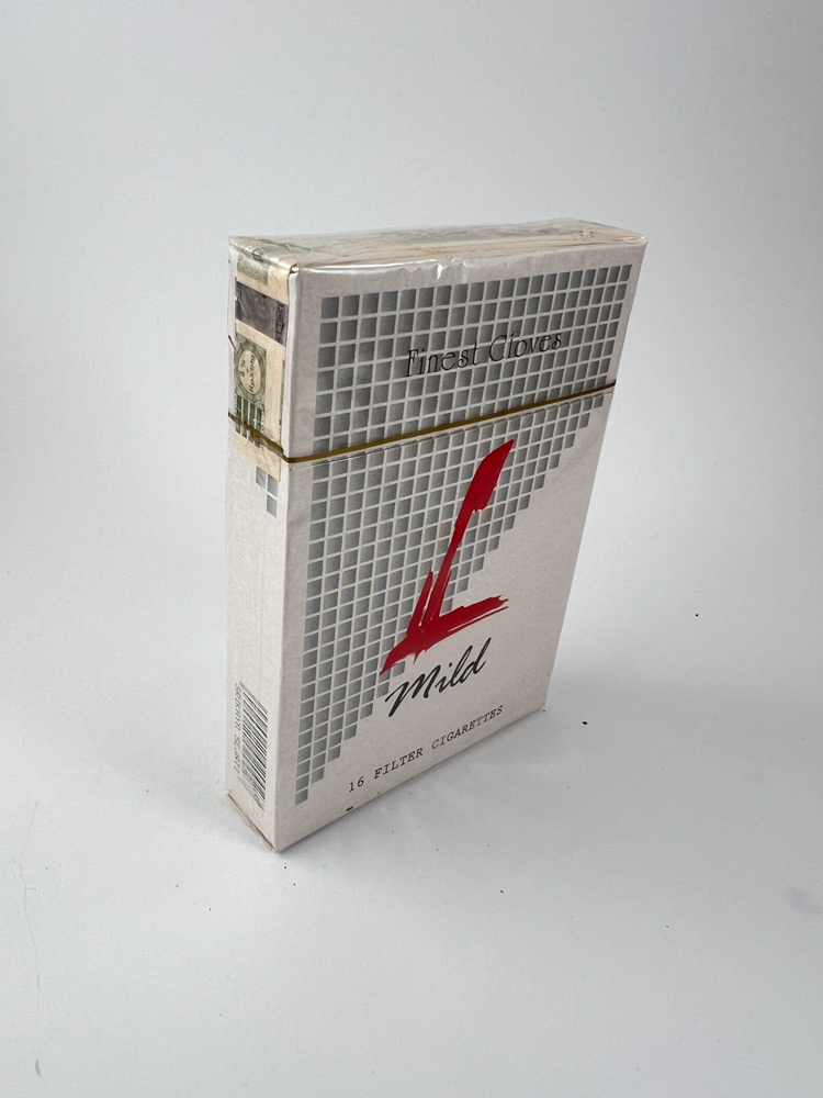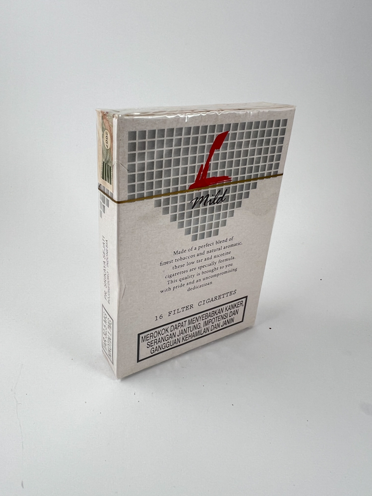L Mild is one of Indonesia's most famous modern kretek cigarette brands, distinguished by its minimalist and modern design. The pack is light in color with a silver checkered pattern, with a red "L" and the words "Mild" in the center. On the back, there is an English part of the inscription, which indicates that the cigarettes are made from a blend of the highest quality tobacco and natural flavors, with a lower tar and nicotine content. This brand is popular among younger consumers and is considered a product in the "premium mild kretek" category.