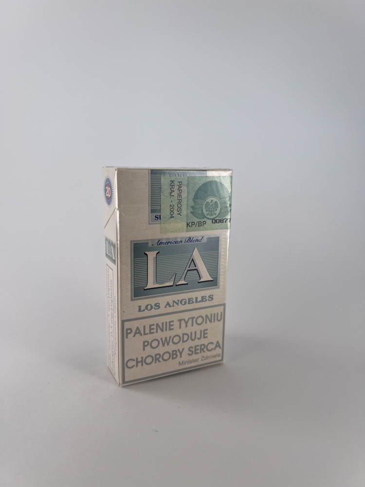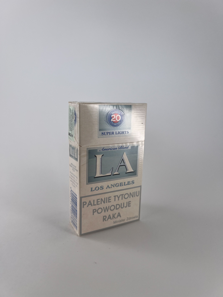 LA (Los Angeles) "Super Lights" is a Polish attempt to stylize itself in the style of American tobacco culture. A light, almost pearlescent background, subtly highlighted blue and silver elements, as well as inscriptions American Blend evokes the image of an "imported" product. It is obvious that this was intended for the mass market, but presented as a higher quality, milder tasting option. Warnings about the harm of smoking are provided in Polish. The package is tightly packed, with an excise stamp from 2004 - this allows you to accurately determine the production period.