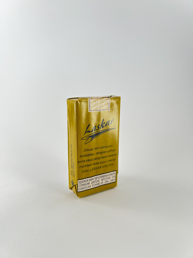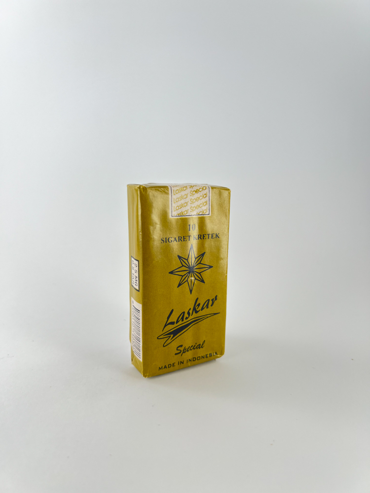 Laskar Special yra tradicinės indonezietiškos kretek tipo cigaretės – tai tabako ir gvazdikėlių mišinys, populiarus visoje Indonezijoje. Šis pakelis, pagamintas „PT. NUGO MULYO“ gamintojo, išsiskiria auksiniu fonu, žvaigždės simboliu ir aiškia tipografika. Ant nugarėlės pateiktas aprašymas apie sudėtį: tabakas, gvazdikėliai bei „saus“ – specialus saldus aromatizatorius, būdingas kretek cigaretėms. Įspėjimas apačioje pateiktas indoneziečių kalba – tai rodo, kad pakelis skirtas vidaus rinkai.