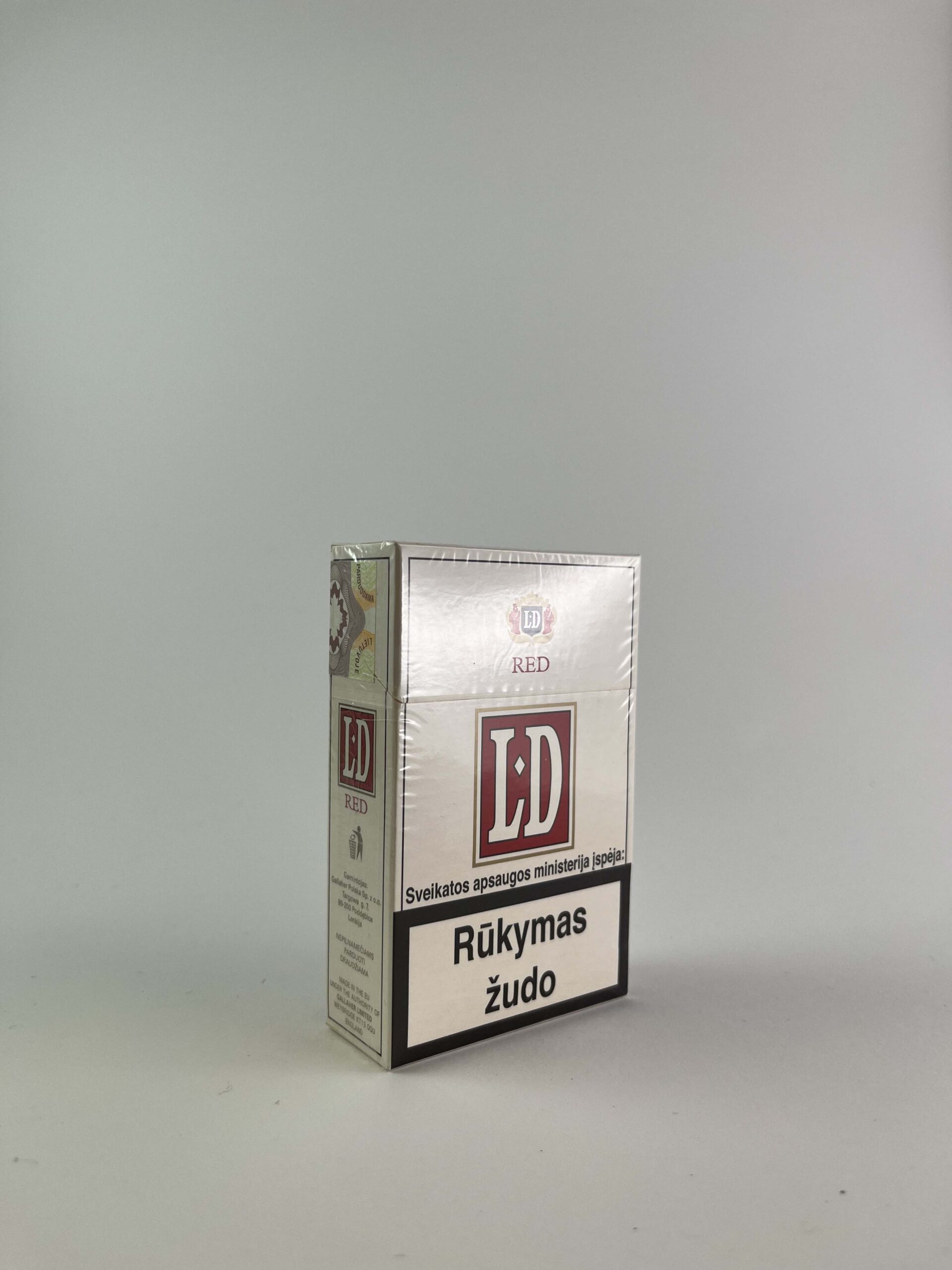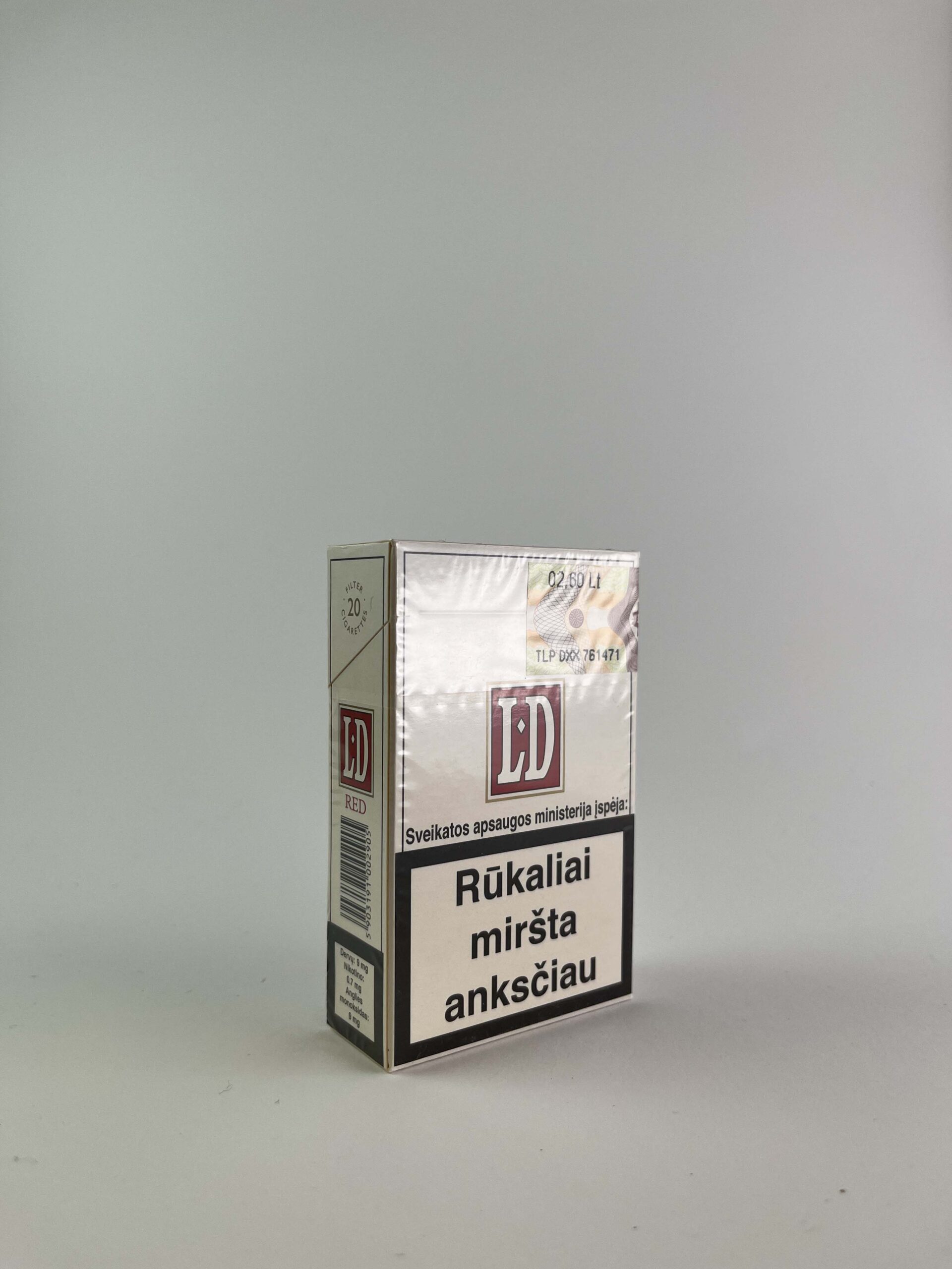 Aprašymas: „LD Red“ cigarečių pakelis išsiskiria minimalistiniu dizainu su raudonais akcentais ir dideliu įspėjimu apie rūkymo žalą sveikatai. Ši pakuotė buvo populiari tarp biudžetinių cigarečių mėgėjų ir yra pažymėta senoviniu Lietuvos mokestiniu ženklu su 2,60 Lt kaina, kas suteikia pakeliui papildomą istorinę vertę.