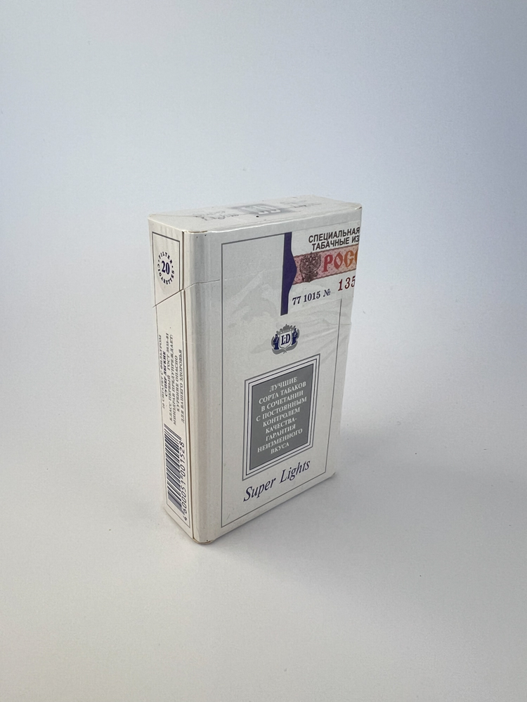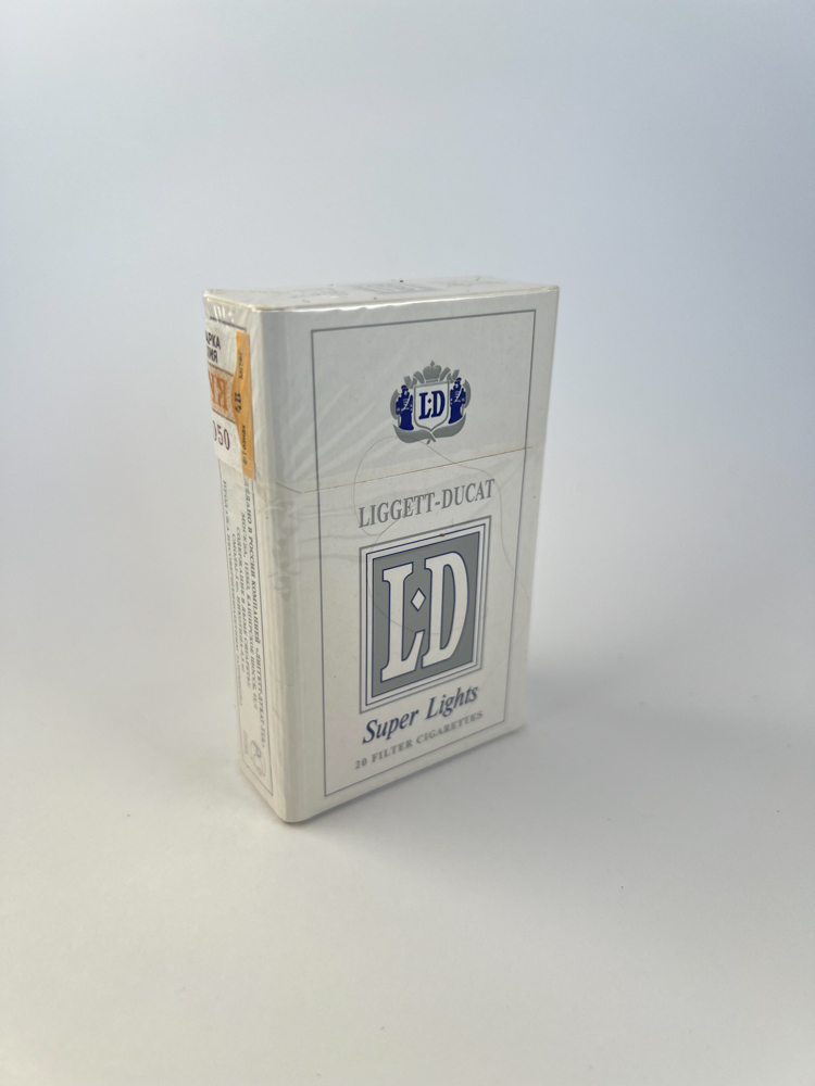 Description: Šis „LD Super Lights“ pakelis yra baltos spalvos su šviesiai mėlynais akcentais, pabrėžiantis lengvumo ir švaros įspūdį. Ant priekinės pusės – LD logotipas ir užrašas „Liggett-Ducat“, nurodantis istorinę priklausomybę šiai JAV-Rusijos bendrovei. Nugarinėje pusėje pateikta reklaminė informacija apie tabako kokybę. Ant viršaus ir šono yra rusiškas akcizo ženklas, pakelis nepažeistas, užklijuotas originalia plėvele. Tai klasikinis LD linijos pavyzdys iš Rusijos rinkos.
