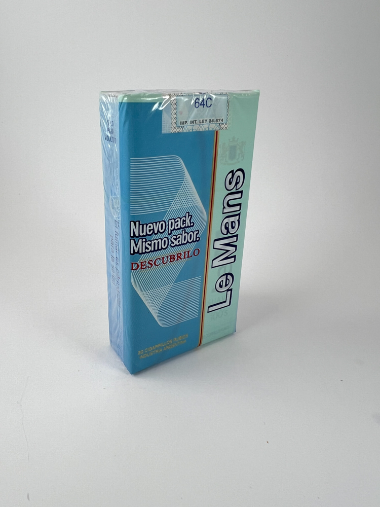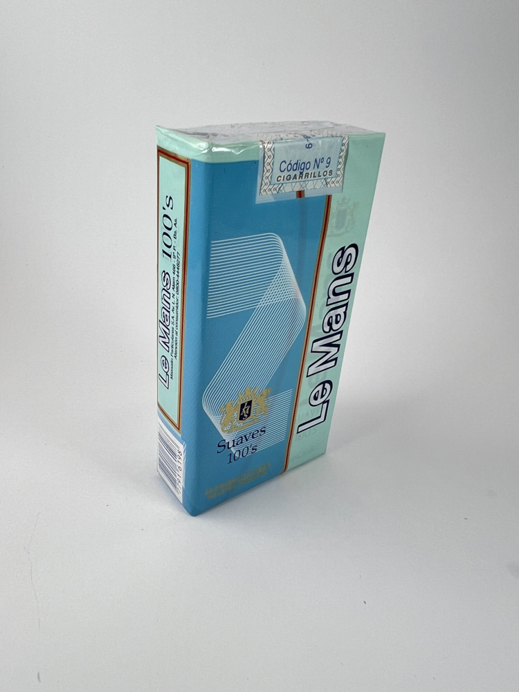 „Le Mans 100’s Suaves“ – tai Argentinos gamybos cigarečių pakelis, išsiskiriantis mėlynos ir žalsvos spalvų deriniu su grafiškai išraiškingu „Le Mans“ užrašu ir šviesiu, abstrakčiu logotipu. Priekinėje pusėje pažymėtas „Suaves 100’s“ – tai nurodo švelnesnį skonį ir pailgintą cigarečių formatą. Viename pakelio variante nurodyta „Nuevo pack. Mismo sabor“ („Nauja pakuotė. Tas pats skonis“), o tai rodo, kad tai perkurta versija su modernizuotu dizainu. Pakuotė turi originalius akcizo lipdukus – vienas su kodu „Nº 9“, kitas – „64C“.