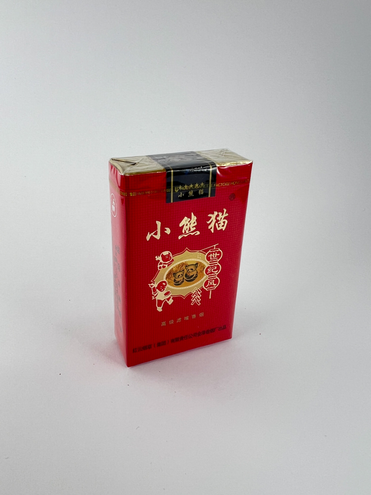 The Lesser Panda cigarette pack features a bright red background, gold and black accents, and an illustration of two pandas in the center. This product is manufactured by Hongyun Tobacco (Group) Co., Ltd. through Huize Cigarette Factory (Yunnan Province), China. It is a type of so-called „Class A Cigarettes“ intended for the domestic market. The front and back of the pack use both English and Chinese, and the design focuses on Chinese cultural symbols. The pack is unopened, cellophane-wrapped, and in excellent collectible condition.