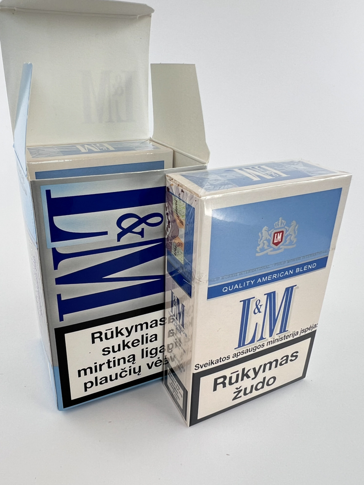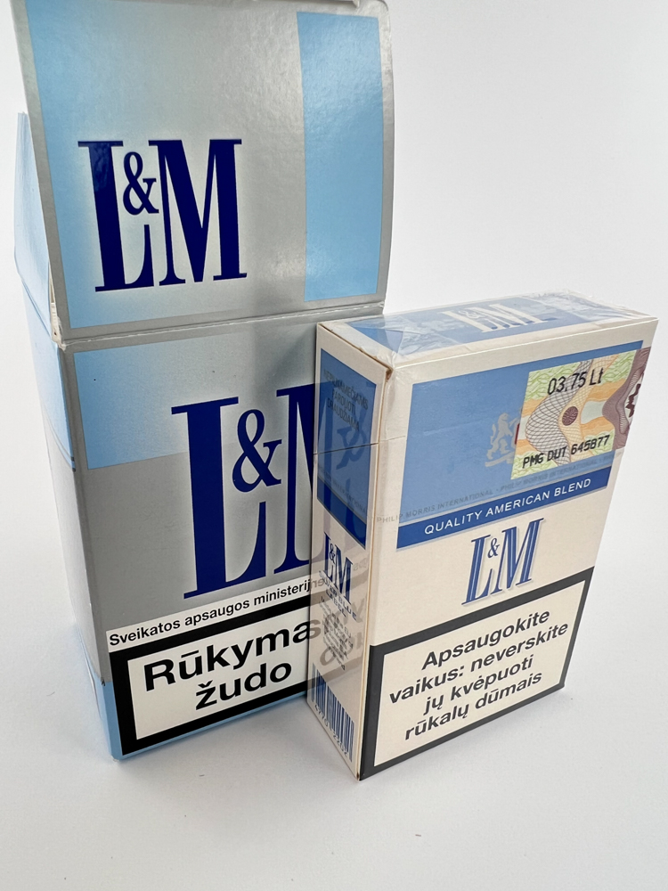 Description: This pack of L&M „Lights” cigarettes stands out with its light blue design with a classic logo. The pack is intended for the Lithuanian market, as evidenced by the Lithuanian warnings about the harm of smoking („Smoking kills“, „Smoking causes a fatal disease – lung cancer“, „Protect children…“) and a clearly visible excise stamp with the price – LTL 3.75. This is one of the older designs used in Lithuania before the introduction of the graphic warning standard (until 2004). The packaging is intact, and the outer box next to it indicates that this may be a set of more packs.