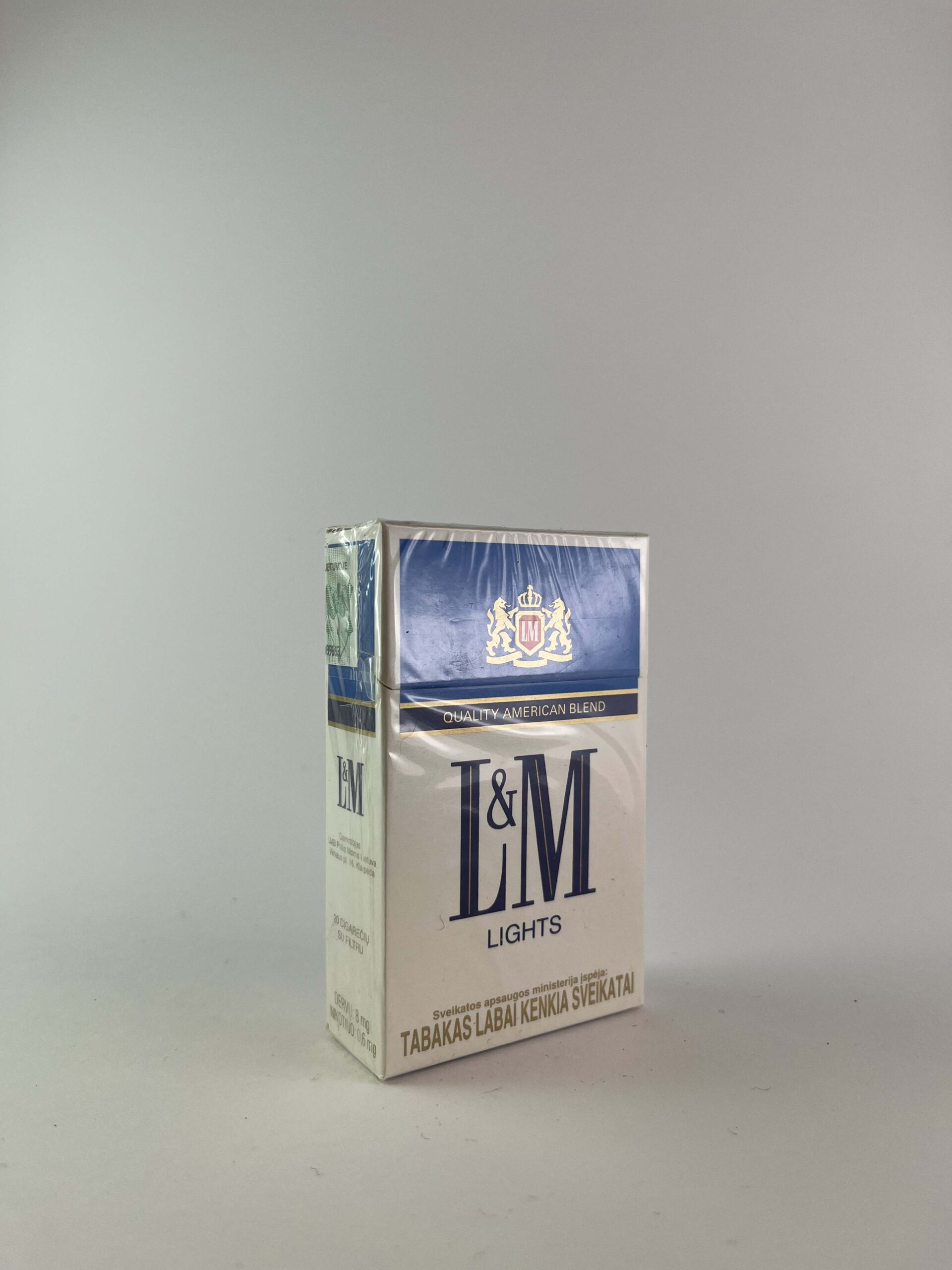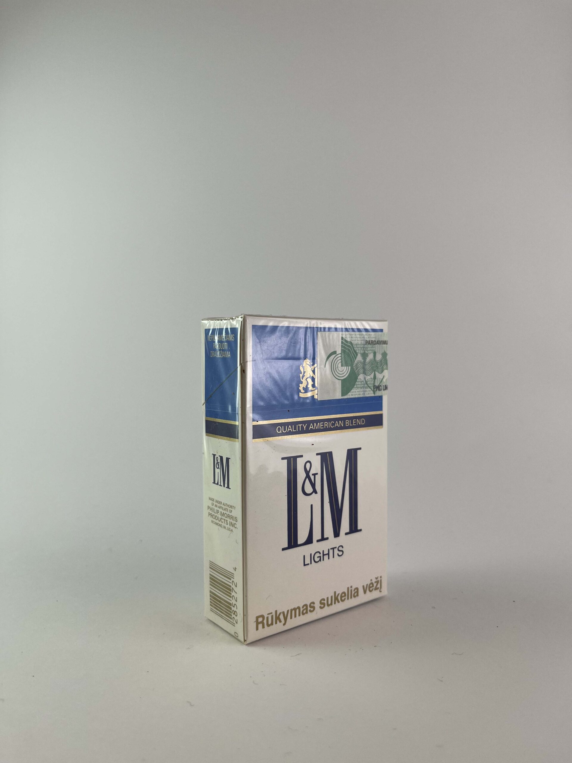 Description: This pack of L&M Lights cigarettes has a typical blue and white design that stands out for its elegance and simplicity. The pack features warnings about the harms of smoking, which was common for the US market. The pack is originally sealed, so it retains its collector's value.
