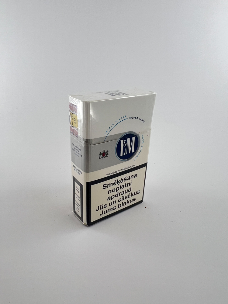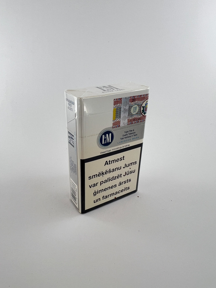 This pack of L&M Luminous Mark cigarettes is an exclusive silver edition with the words Triple Filter and a subtly integrated Silver Label. The pack is intended for the Latvian market, as evidenced by the warnings in Latvian and the Latvian excise sticker. The design is restrained, with the blue L&M logo and clean lines. At the bottom it is indicated that this is a LUMINOUS MARK edition - this was a limited L&M design line that did not last long on the market.