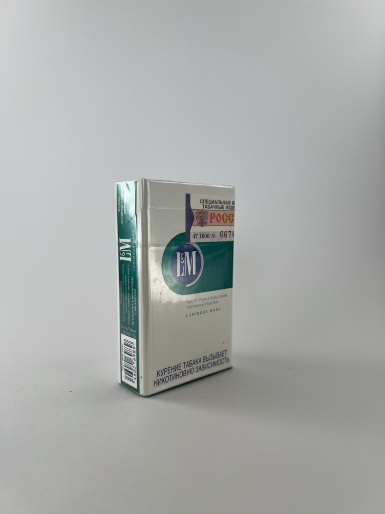 This is an edition of L&M Menthol Lights with the inscription „Luminous Mark“, which indicates a special design or manufacturing feature, usually related to shiny surfaces or technologies (in this case, a metallic color in the center of the pack). The pack design is white with a greenish-blue zone in the center and the blue L&M logo. This model is intended to emphasize the impression of freshness and cleanliness characteristic of menthol cigarettes. The original packaging with Russian language warnings and an excise stamp confirms that it was distributed to the Russian market.