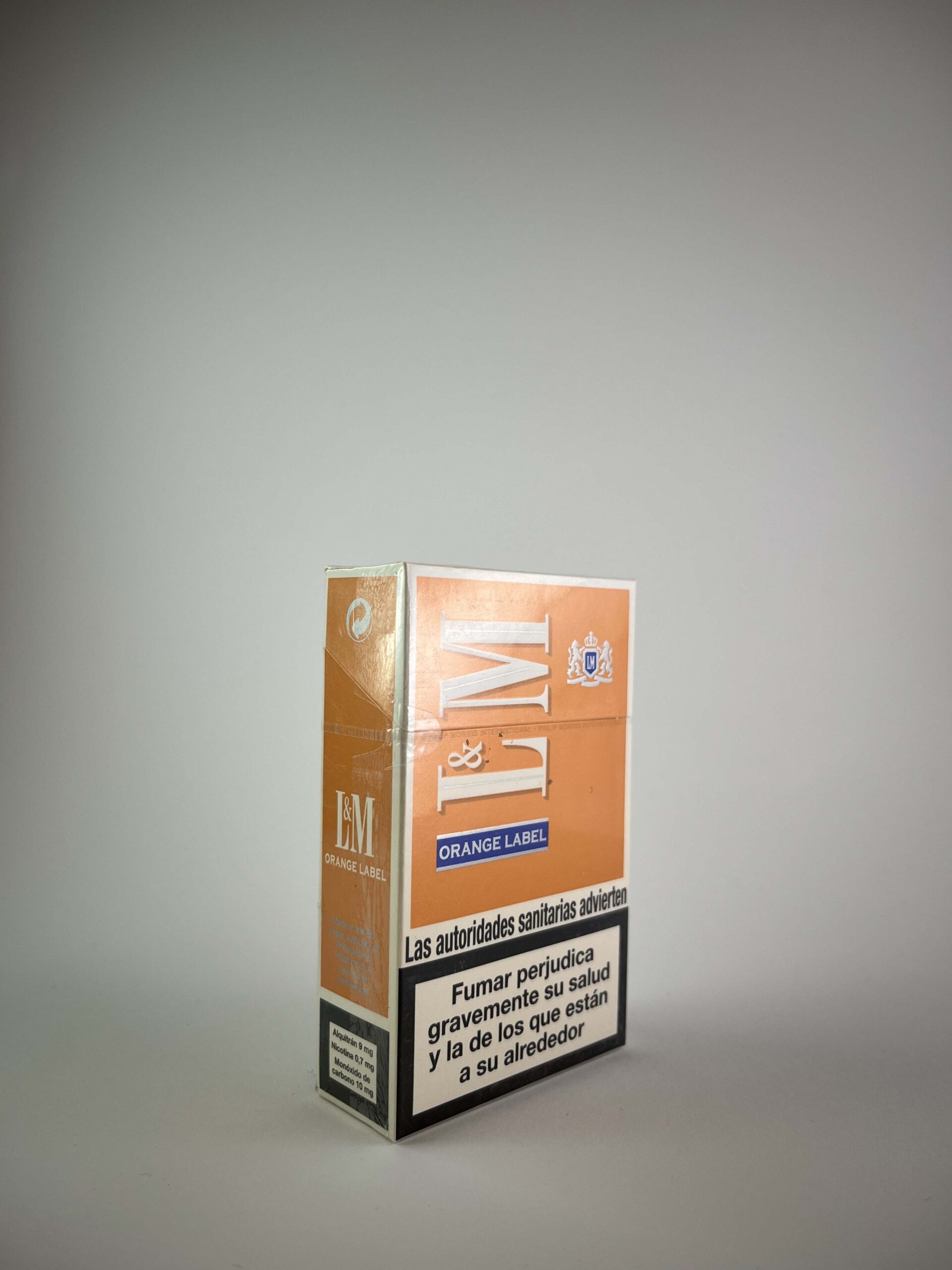 Description: This pack of L&M Orange Label cigarettes features a bright orange design, a distinctive brand logo and subtly integrated graphic elements. The highlight of this edition is a high-quality orange tobacco blend tailored for a subtle taste. The pack clearly displays health warnings in Spanish, highlighting the harms of smoking, as well as tax stamps confirming the product is made in Spain.