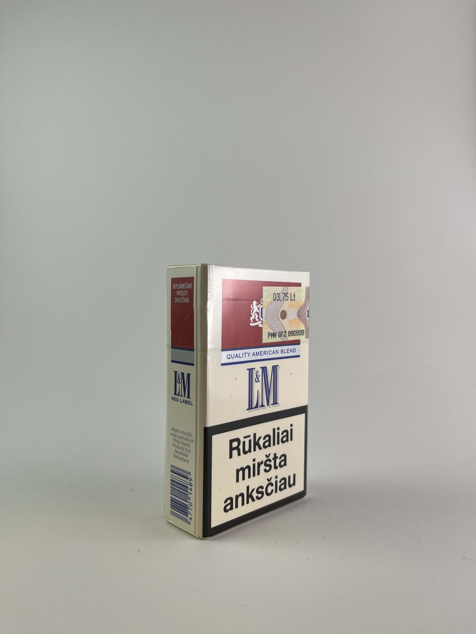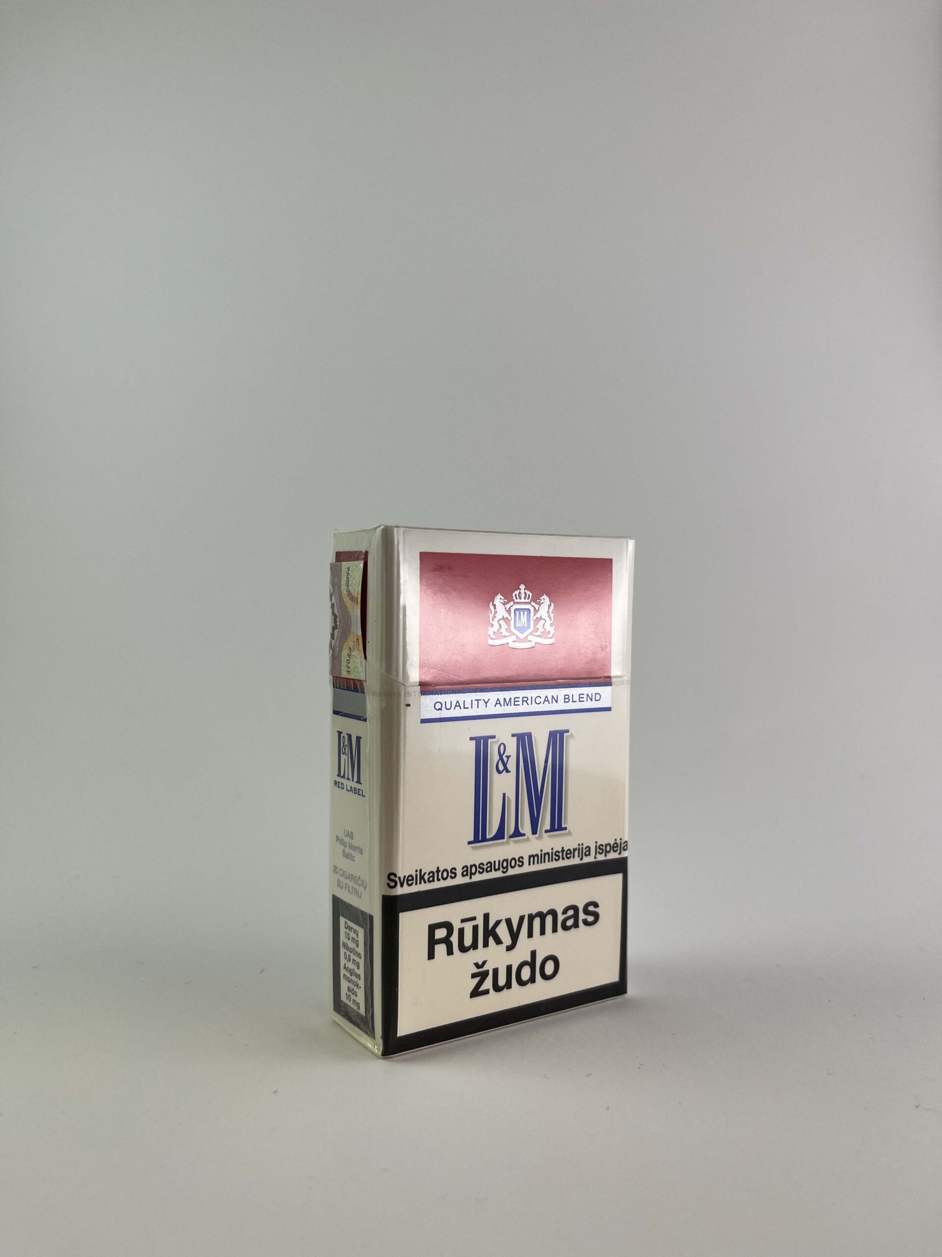 - Description: Pakelis paprastos baltos ir raudonos spalvų kombinacijos su L&M logotipu ir „Red Label“ ženklinimu, simbolizuojantis stipresnį skonį. Ant pakelio yra įspėjimai apie rūkymo žalą sveikatai.