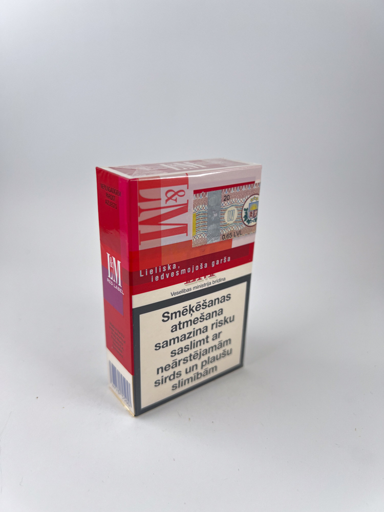 The left side is marked "L&M Red Label" and the inscriptions are given Latvian language, which indicates the package's destination for the local Latvian market.