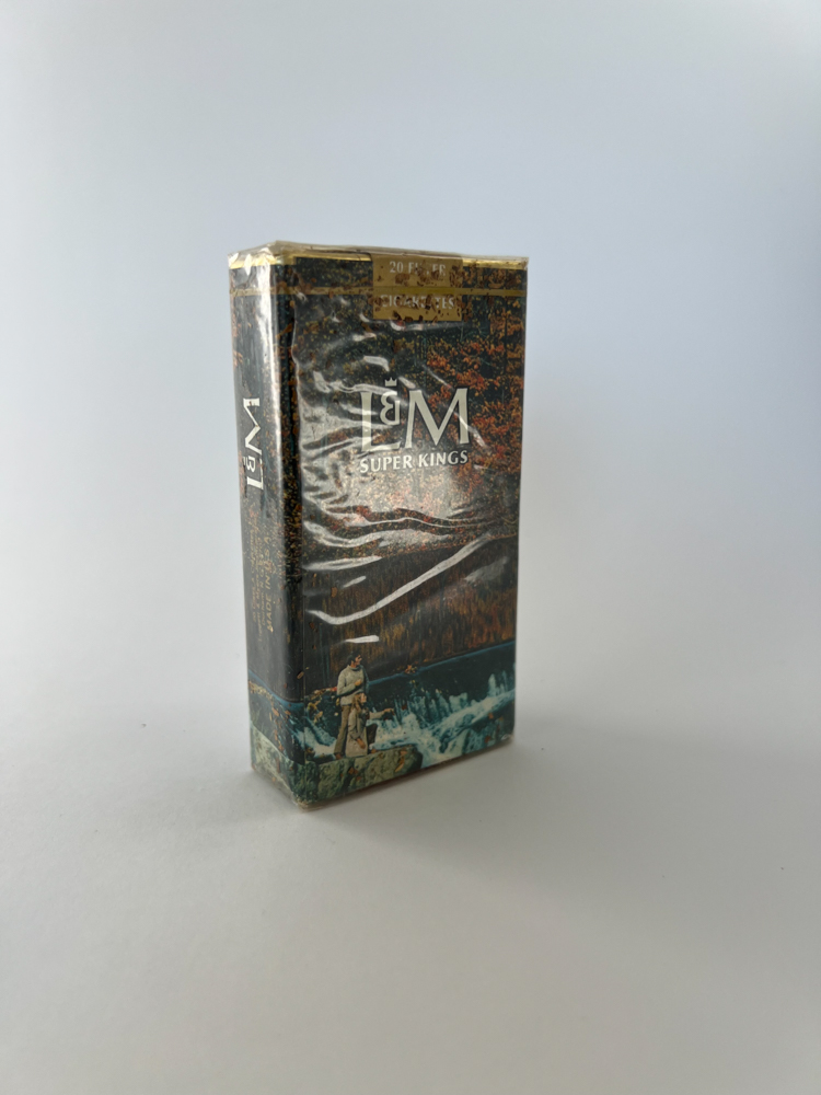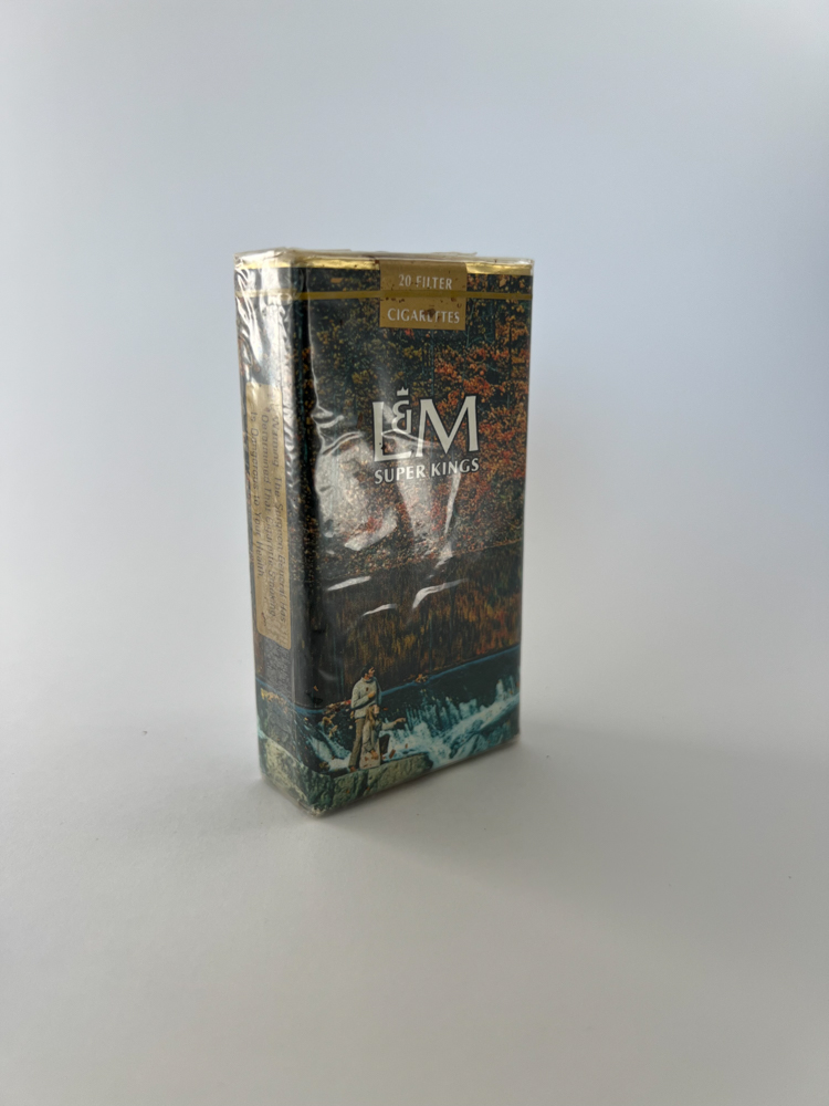 This L&M Super Kings pack is one of the special illustrated editions released for the US market in the 1980s and 1990s. The pack features an artistic design with a natural scene in the background – a man fishing in a river, and birds flying overhead. All of this conveys the masculine, adventurous lifestyle that was typical of cigarette advertising of this period.
