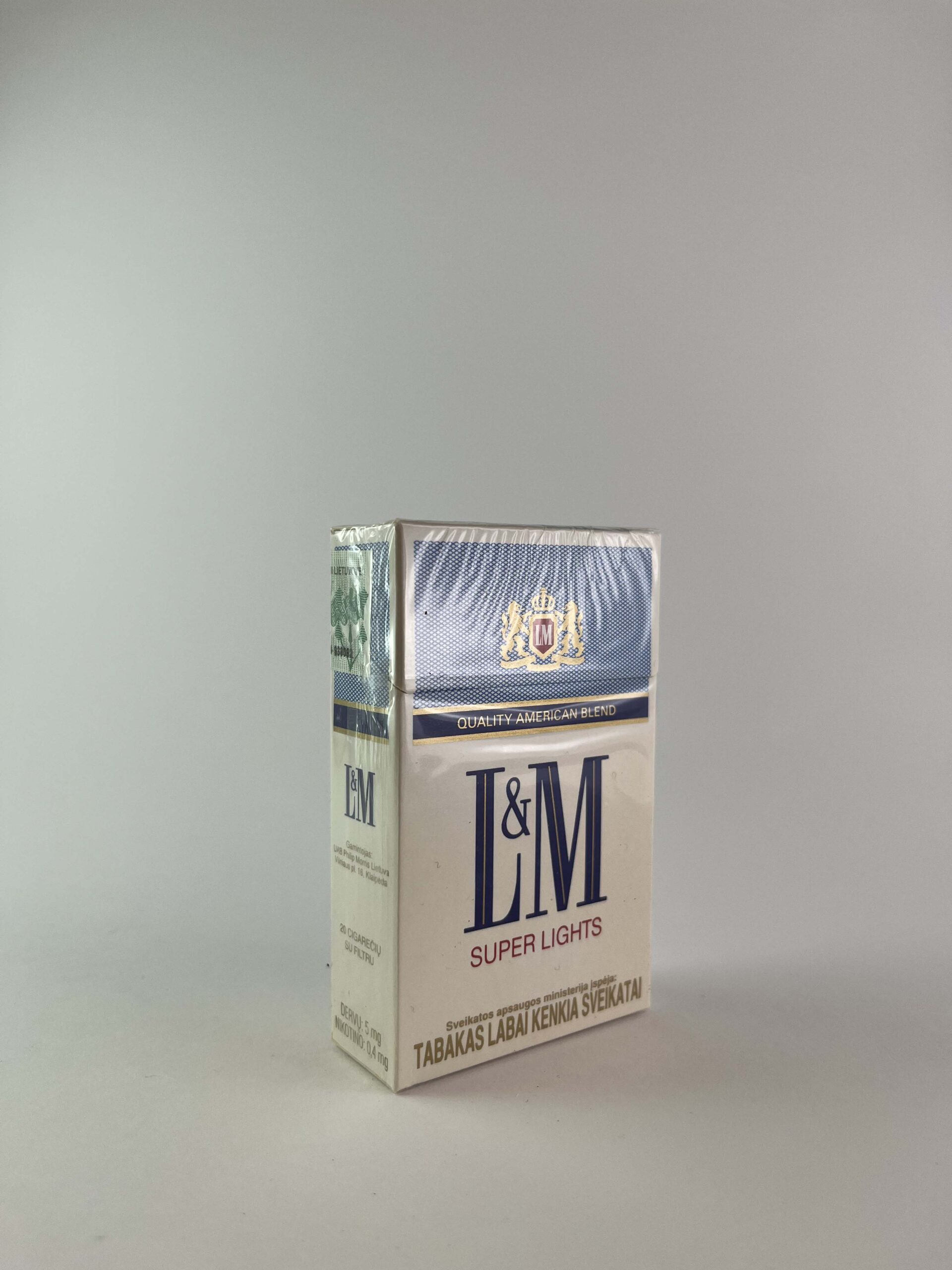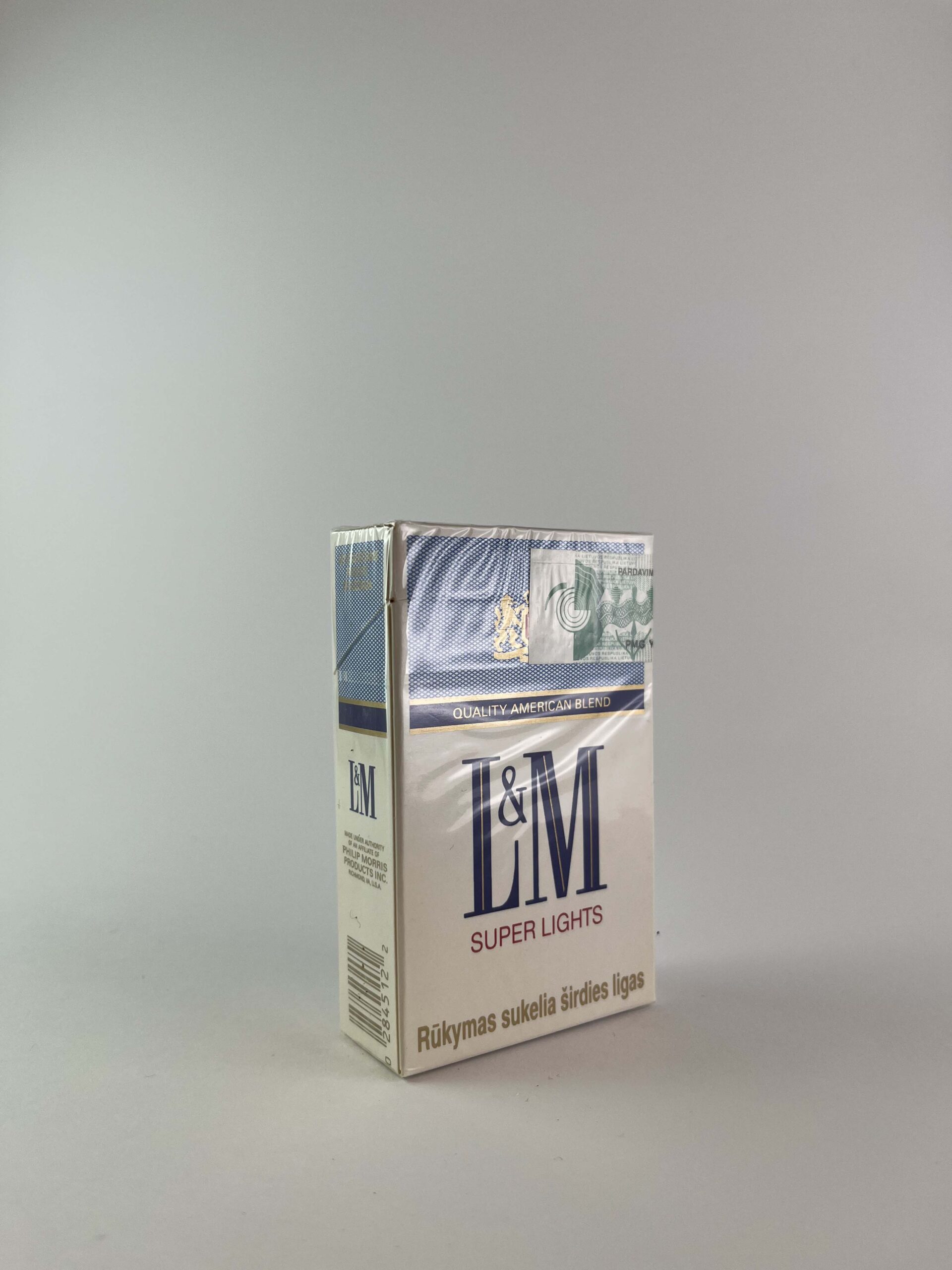 Description: The L&M Super Lights cigarette pack features a classic blue and white color combination, reflecting the lighter flavor and lower tar content of the cigarettes. The pack features health warnings specific to the American market. The pack is originally sealed, which increases its collectible value.