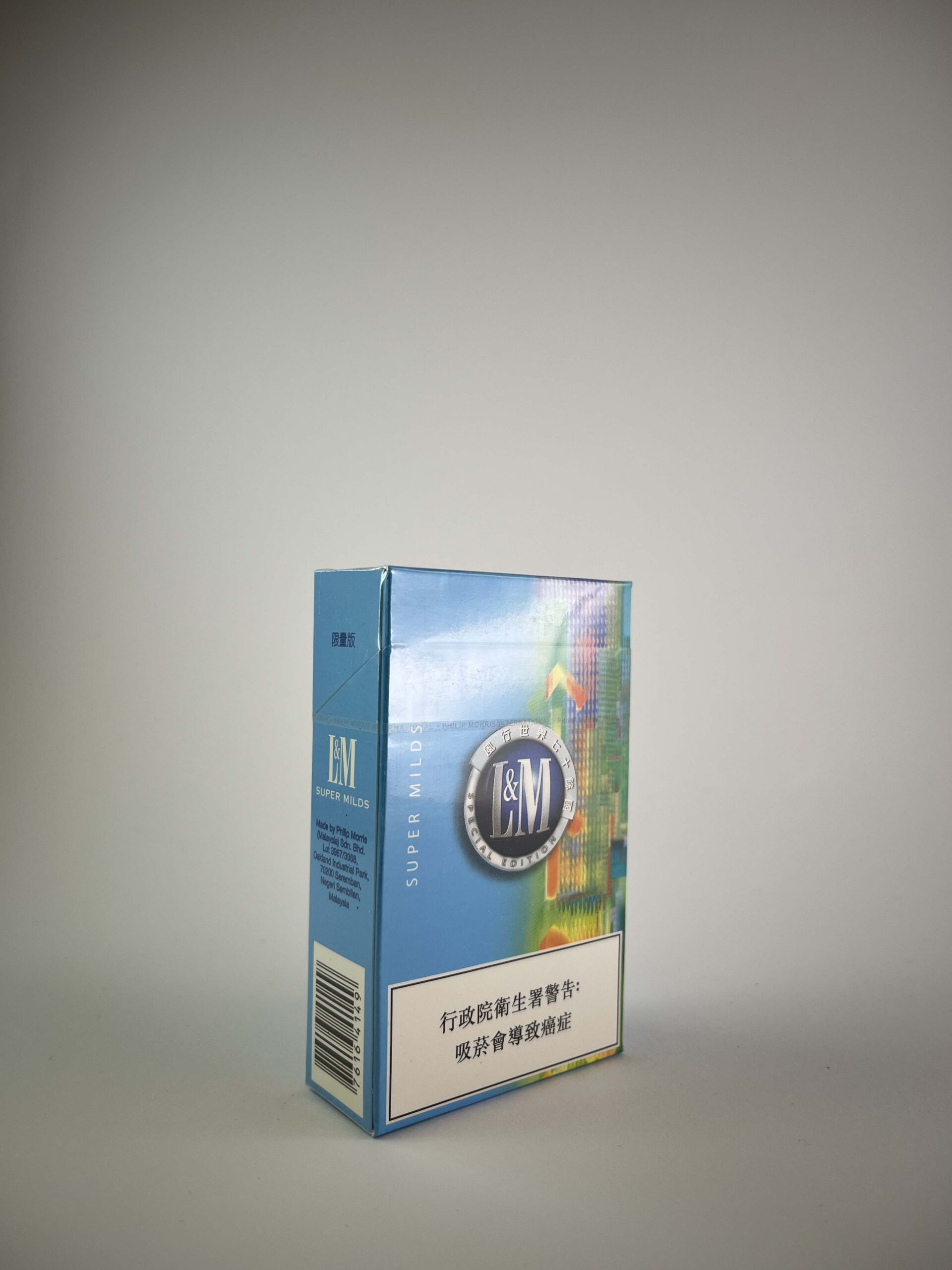 „The L&M Super Milds – Special Edition cigarette pack has a colorful and modern design, dominated by blue with bright graphic elements reminiscent of city lights. Warnings in Chinese are clearly visible on the pack, indicating that this pack was intended for the Asian market. The “Special Edition„ inscription gives the edition a unique character, emphasizing its difference from the standard L&M editions. This pack reflects the quality and popularity of the L&M brand internationally.