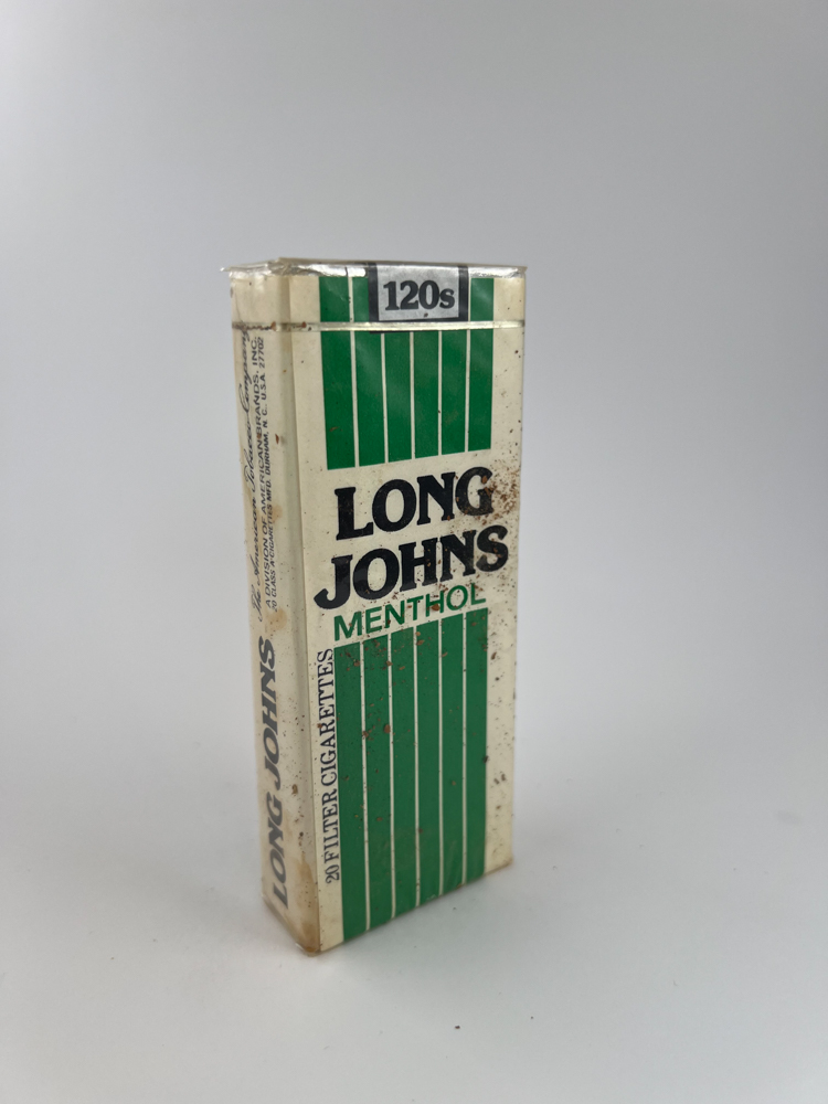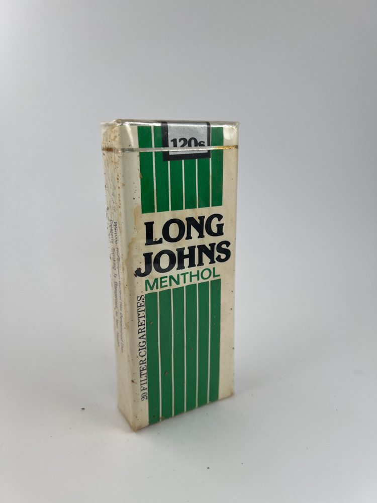 „Long Johns Menthol 120s is a long-format menthol cigarette pack for the US market, which features a simple but distinctive design: a white background with vertical green stripes and a black Long Johns inscription, with the word “120s„ clearly marked at the top. The side of the pack contains manufacturer information and a warning about the harms of smoking. Visually, the pack resembles a minimalist American design style, but its surface clearly shows signs of aging: stains, darkening and possible areas of film damage.
