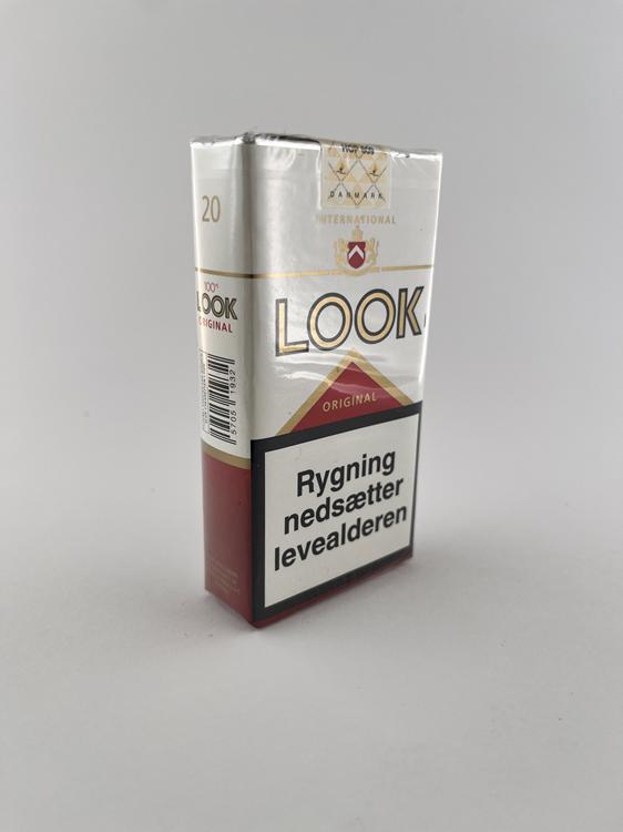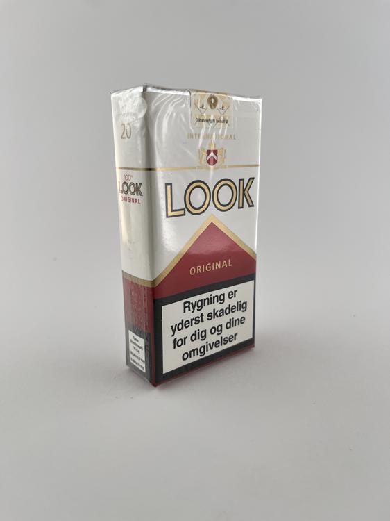 Aprašymas: Šis LOOK „Original“ cigarečių pakelis pasižymi šviesiu, minimalistiniu dizainu su balta spalvine baze, papildyta raudonais ir aukso spalvos elementais. Priekinėje dalyje išryškintas „LOOK“ logotipas bei klasikinis trikampio formos grafinis akcentas, būdingas šiam prekės ženklui. Viršutinėje dalyje matomas Danijos simbolika paremtas ženklinimas, pabrėžiantis gamintojo kilmę. Pakelis skirtas Danijos rinkai, ką patvirtina daniški sveikatos įspėjimai. Dizainas atitinka laikotarpį prieš standartizuotų pakuočių įvedimą Europos Sąjungoje. Bendras vaizdas tvarkingas, spalvos išlikusios ryškios, pakelis išlaikęs formą.