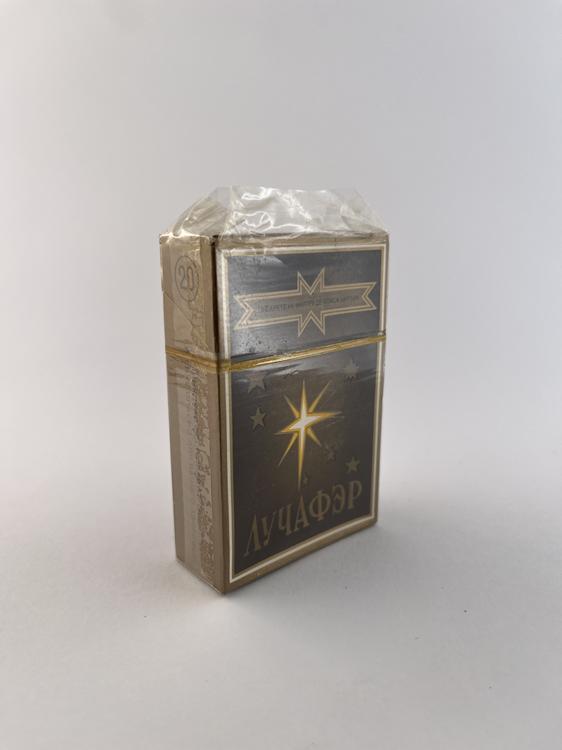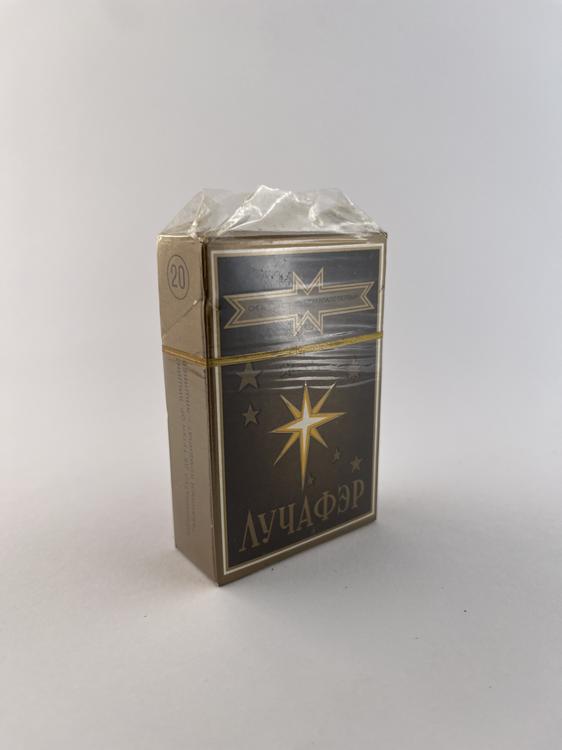 Aprašymas: „Лучафор“ cigarečių pakelis pasižymi išskirtiniu, dekoratyviu sovietinio laikotarpio dizainu. Tamsiame (juodai rudos spalvos) fone dominuoja stilizuota auksinė žvaigždė su švytėjimo efektu, aplink išdėstytos mažesnės žvaigždės, suteikiančios kosminės ar simbolinės šviesos tematiką. Viršutinėje dalyje – dekoratyvinis ornamentas su klasikiniais sovietiniais grafikos elementais. Spalvinė gama (auksas + tamsus fonas) suteikia pakeliui prabangos ir išskirtinumo įspūdį, būdingą aukštesnės klasės SSRS cigaretėms. Dizainas ryškiai skiriasi nuo paprastesnių masinių pakelių.