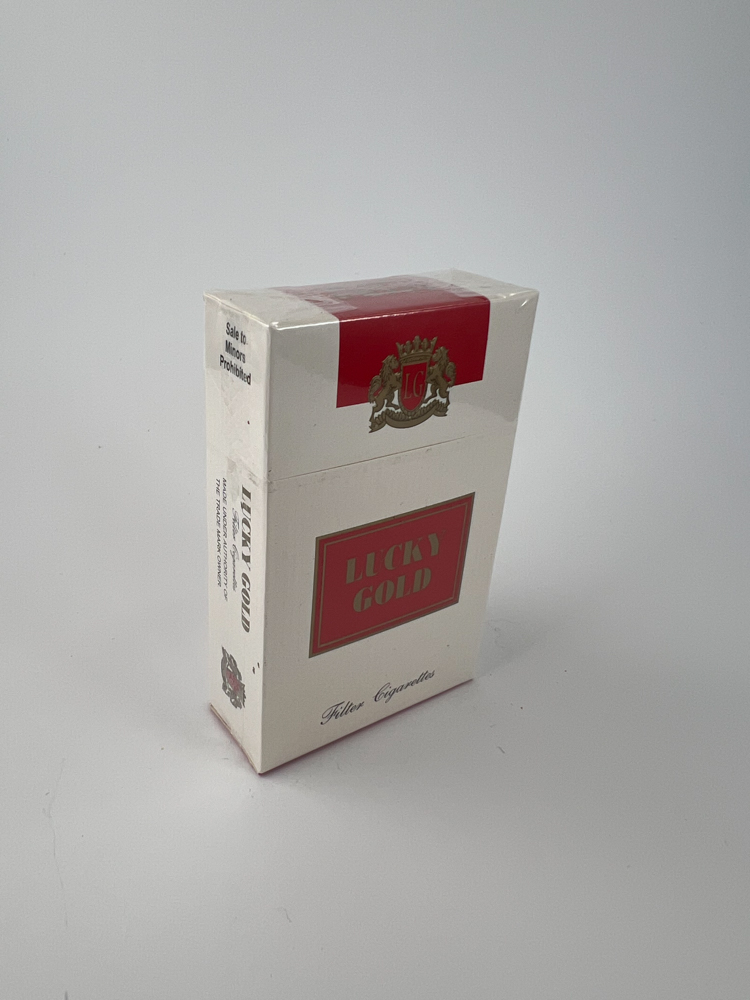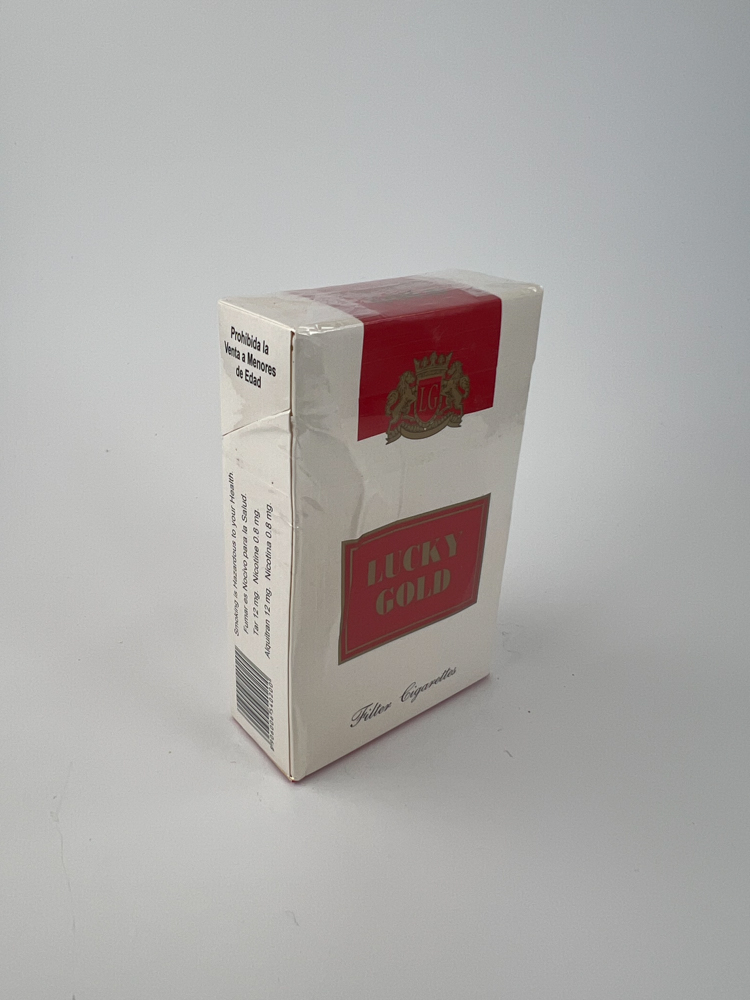 This is a classic-style pack of Lucky Gold cigarettes, manufactured in the Philippines under a US license. The pack design is minimalist – a white background with a red rectangle in the center that says „LUCKY GOLD“. The LG crest with a crown is on top, and the sides of the pack have warnings in Spanish and English. This pack has a typical 1980s-1990s American style, but it was released for the Asian market.