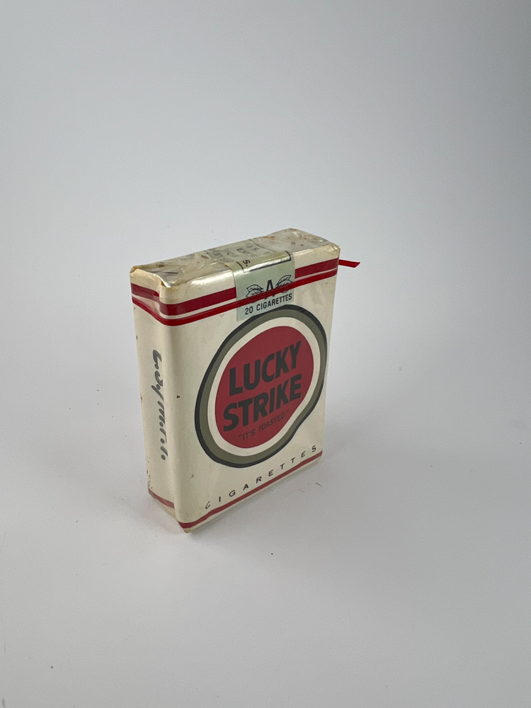 Description: This Lucky Strike "It's Toasted" cigarette pack is a classic design that was widely used in the mid-20th century. The pack is distinguished by its iconic red circle and black lettering, while the slogan "It's Toasted" refers to the brand's distinctive feature - the toasting process. The pack is made of soft paper with a pull-out red strip at the top. This particular unit is unopened, with an excise stamp on top.